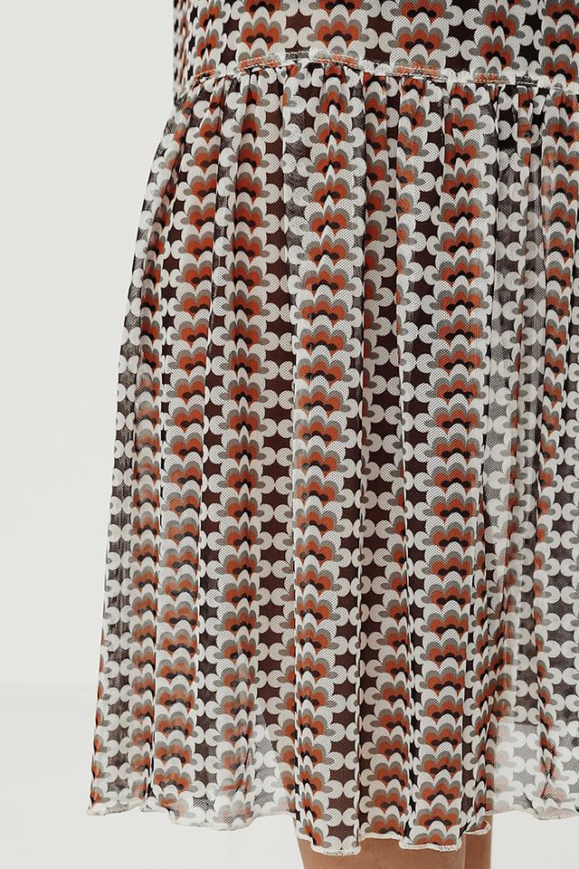 Это платье от Rich and Royal станет прекрасным дополнением к вашему гардеробу. Платье выполнено в коричневой цветовой гамме и украшено мелким принтом в горошек, что придает ему особый шарм.
