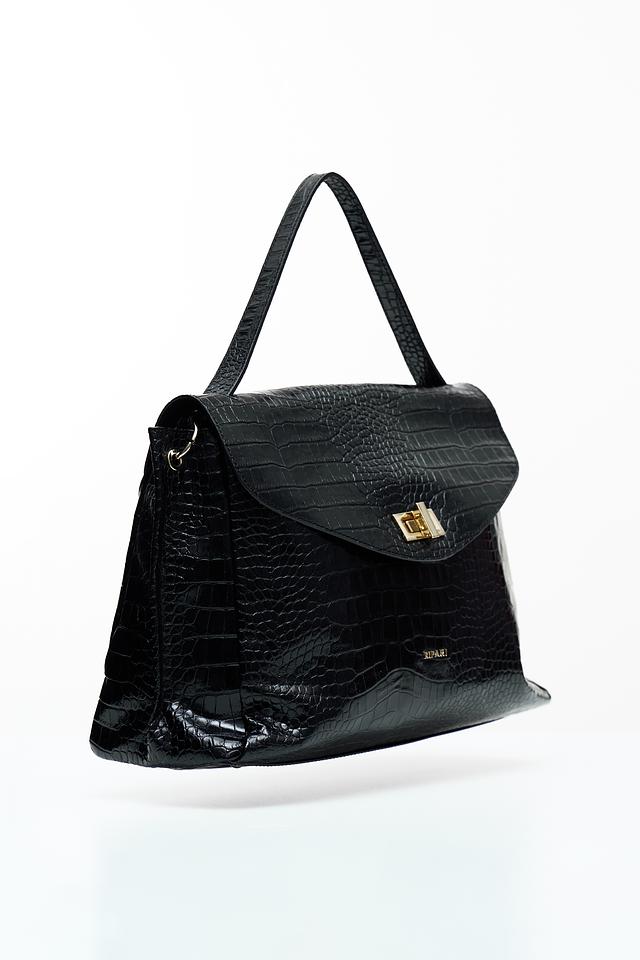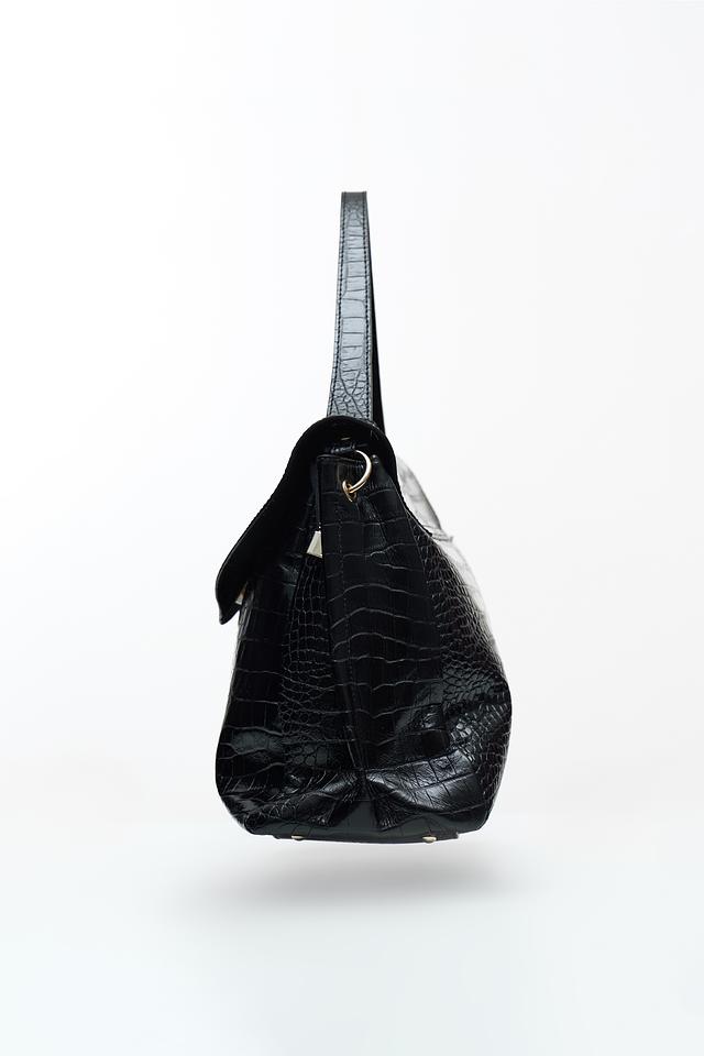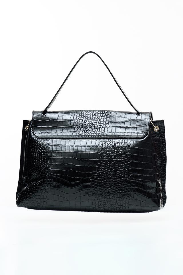 Текстура под крокодила придает сумке особый шарм и изысканность. Чёрный цвет делает её универсальной и подходящей к любому наряду. Сумка имеет удобные ручки для ношения в руке, а также съёмный плечевой ремень для комфортного использования на плече.