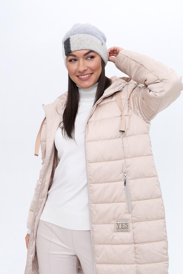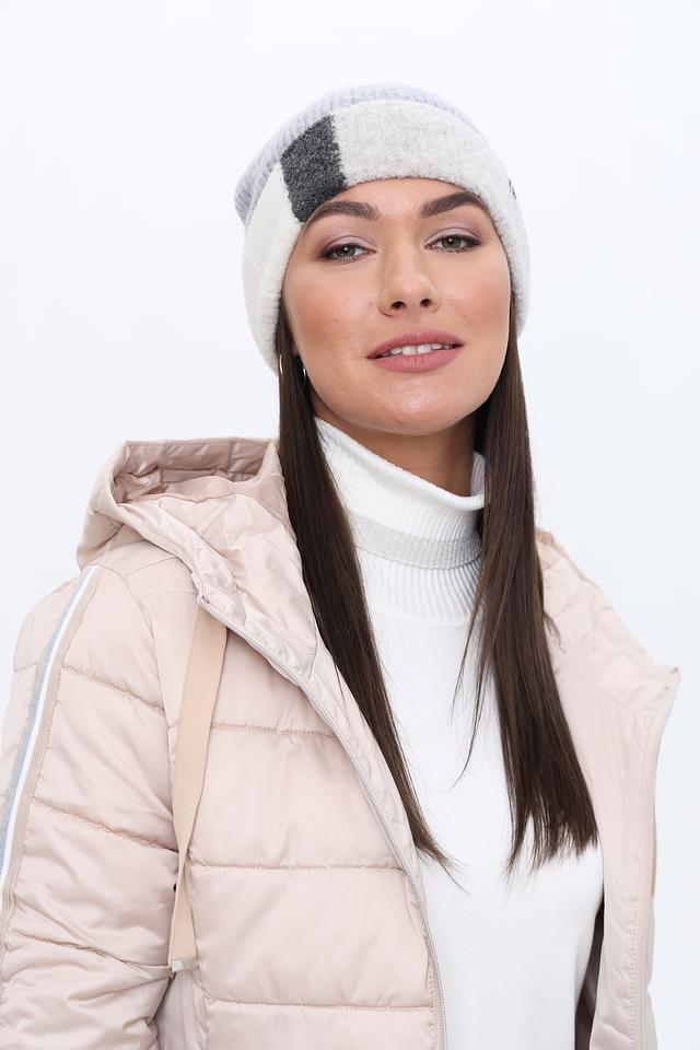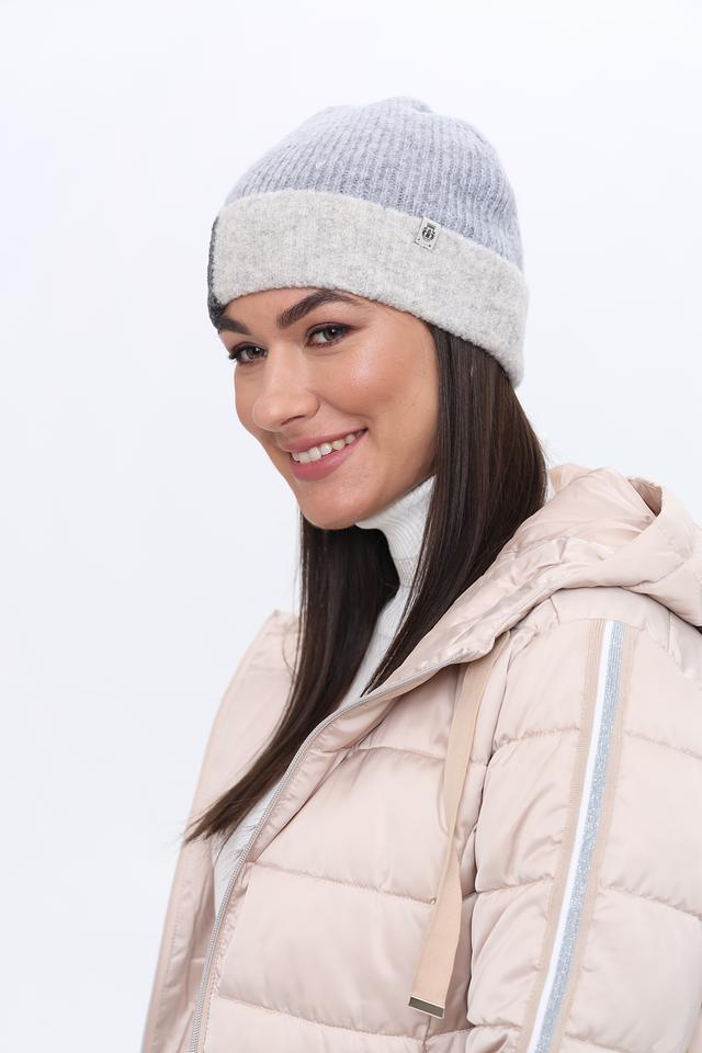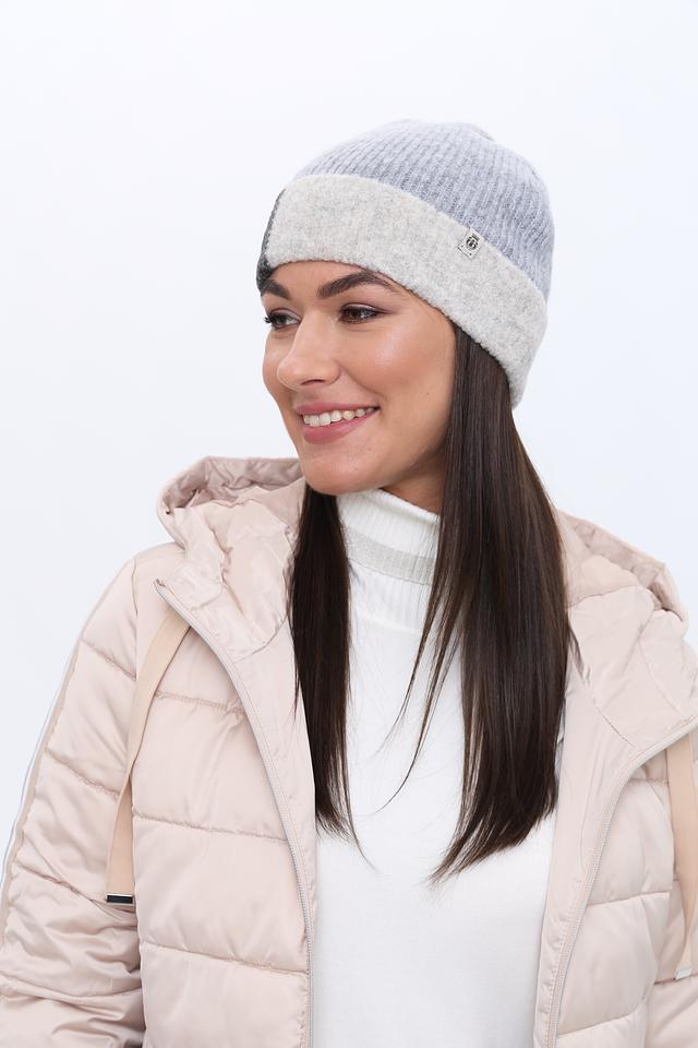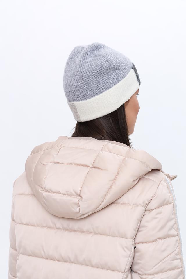 Шапка имеет двухцветный дизайн: верхняя часть выполнена в светло-сером цвете, а нижняя – в более тёмном сером. Такое сочетание делает модель универсальной и легко сочетаемой с различной верхней одеждой.