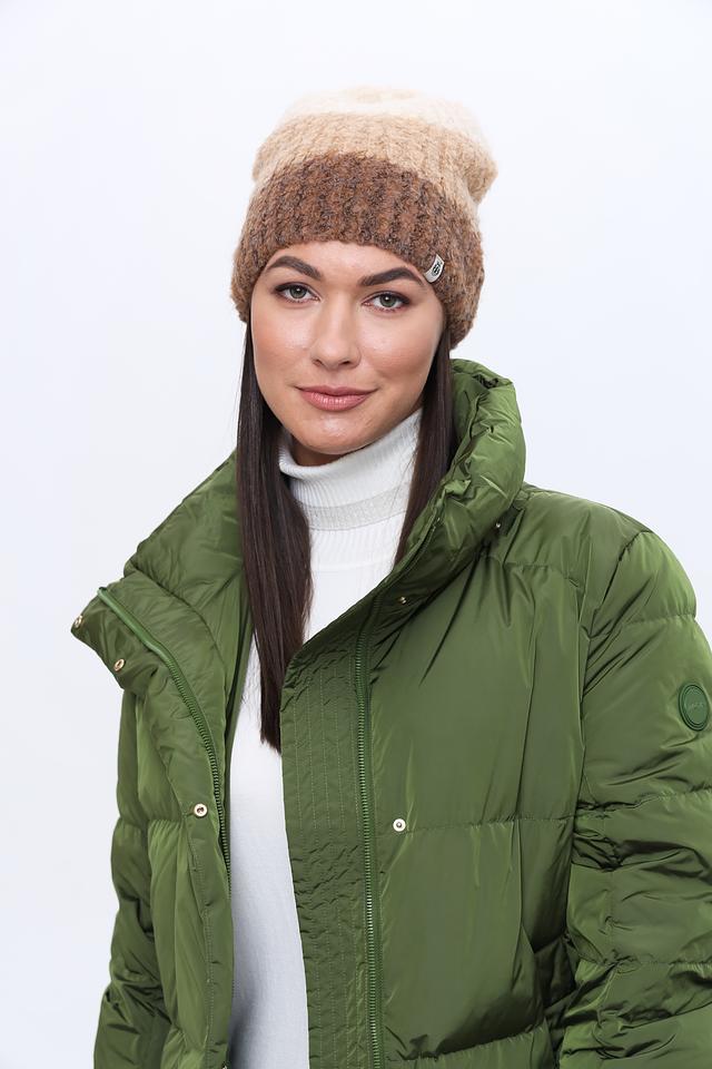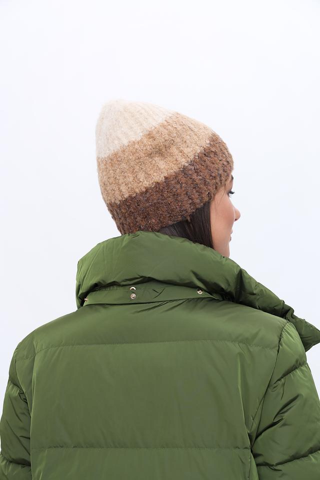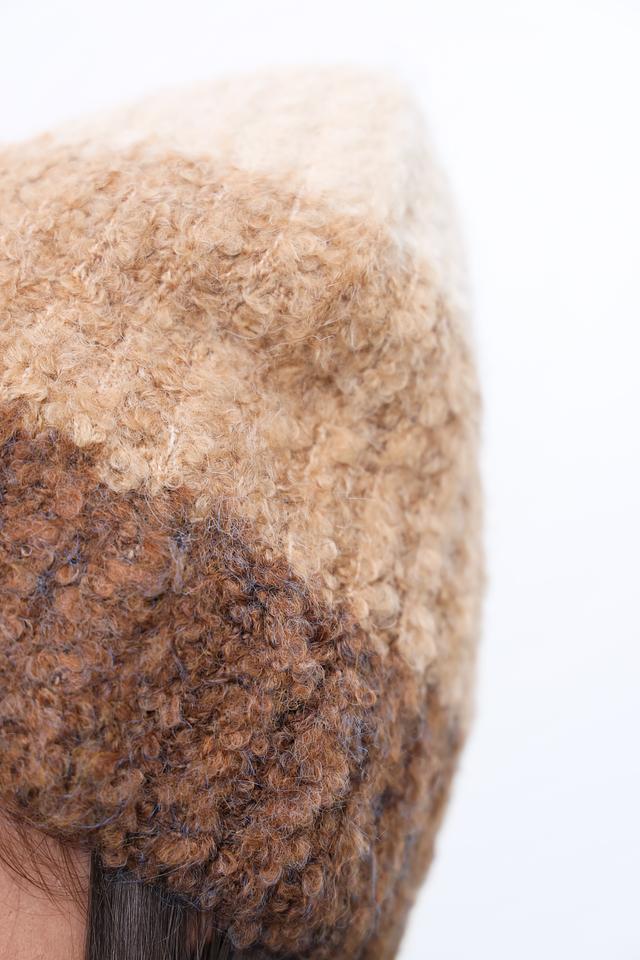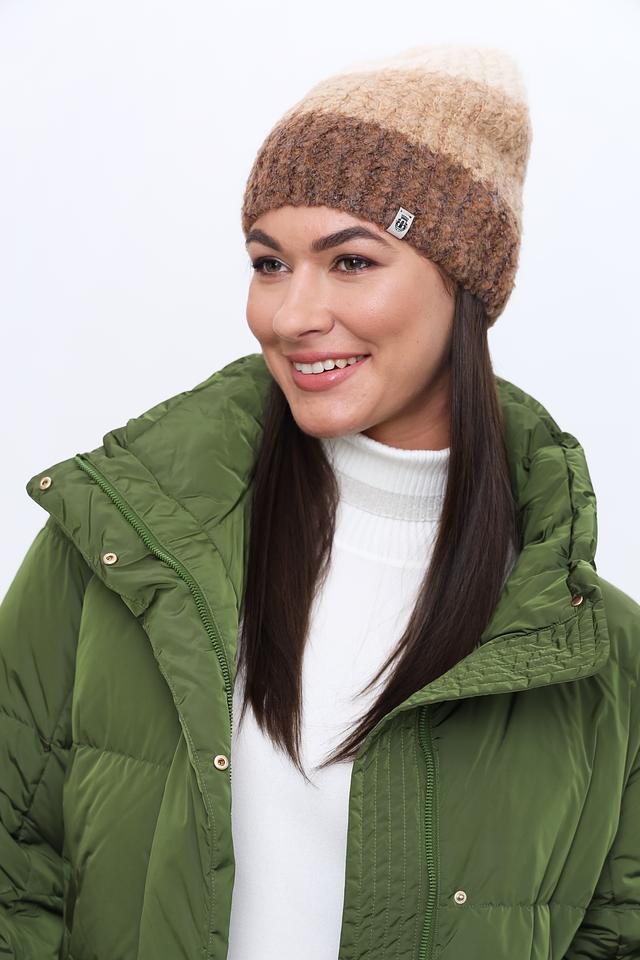 Шапка имеет оригинальный меланжевый окрас, сочетающий в себе оттенки бежевого и коричневого, что делает её универсальной и легко сочетаемой с различной одеждой. Фактурная вязка добавляет шапке объём и визуальный интерес.