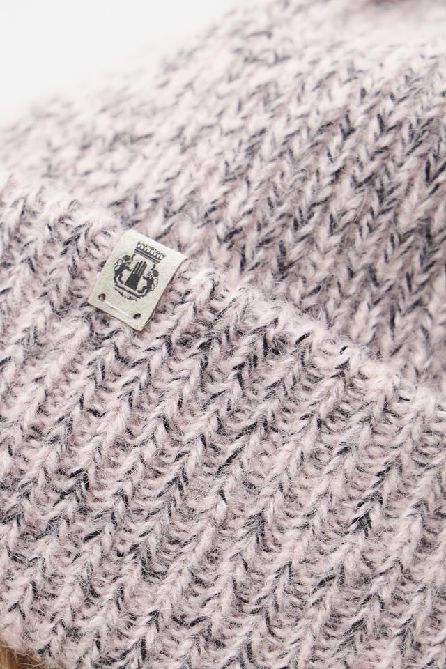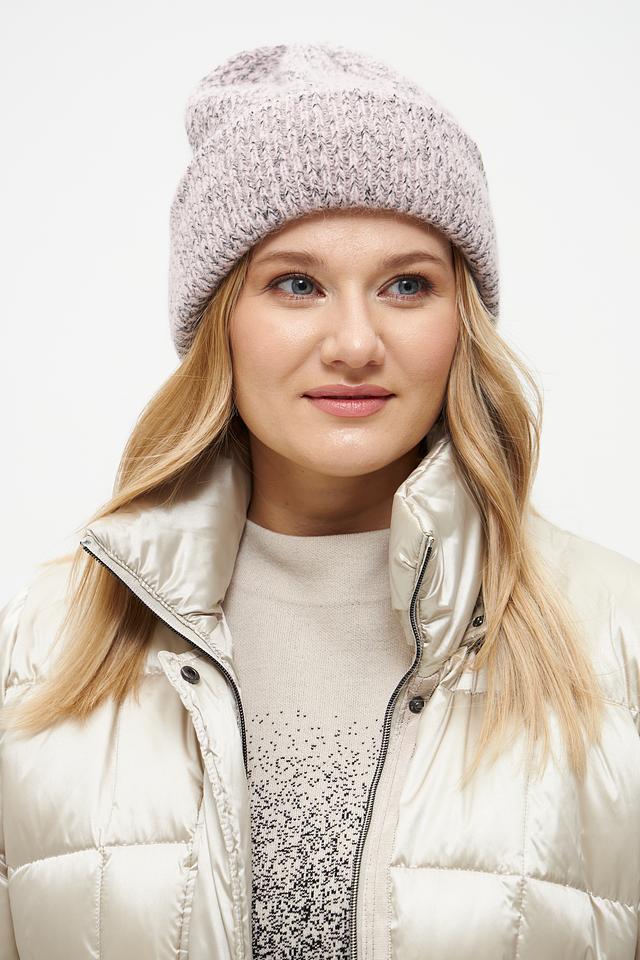 Шапка имеет классический дизайн и лавандовый цвет с вкраплениями более темных нитей, что придает ей интересный текстурный эффект. Вязаная структура обеспечивает хорошую теплоизоляцию, а удобная форма плотно прилегает к голове, защищая от холода.