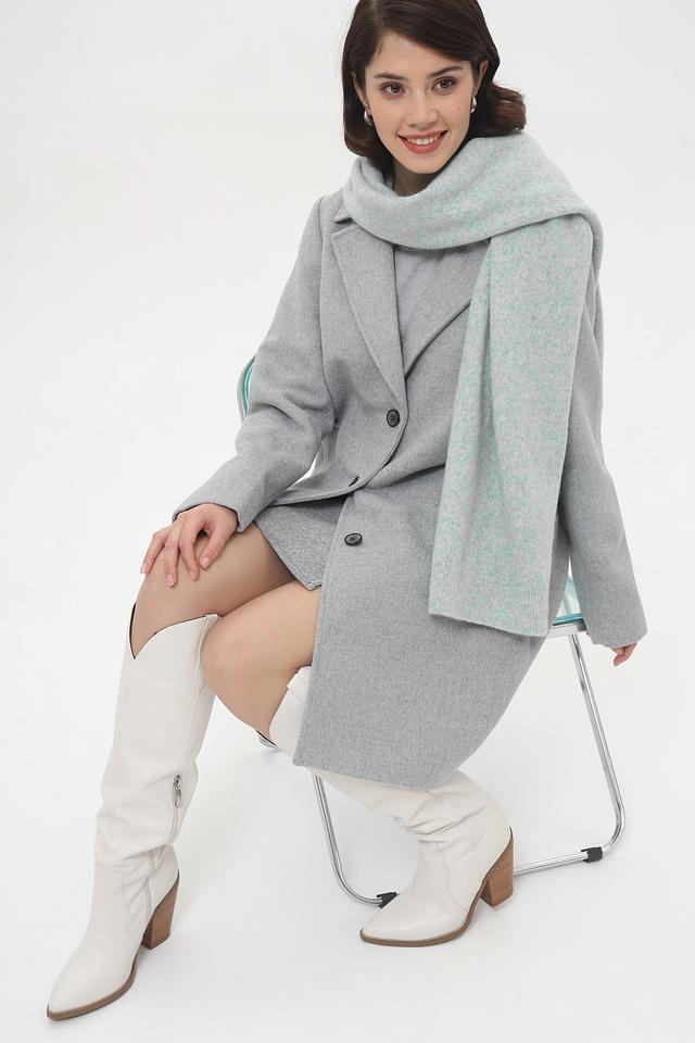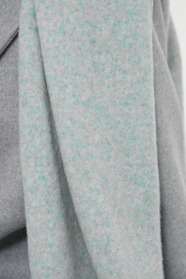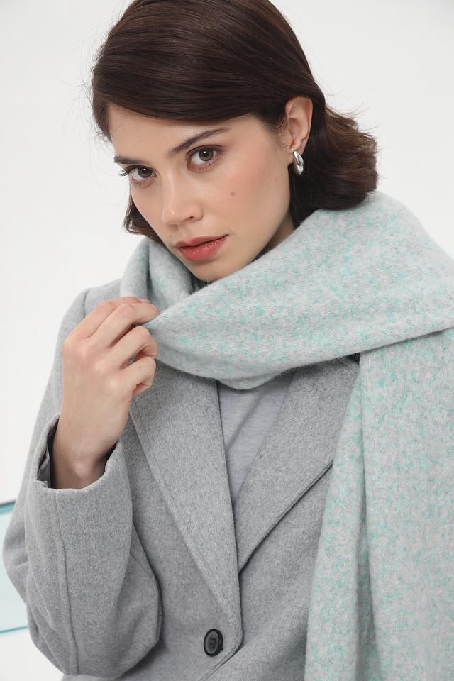 Шарф имеет светло-голубой цвет с меланжированным эффектом, что придает ему уникальный и современный вид. Текстура пряжи создает интересный визуальный эффект и делает шарф особенно привлекательным.
