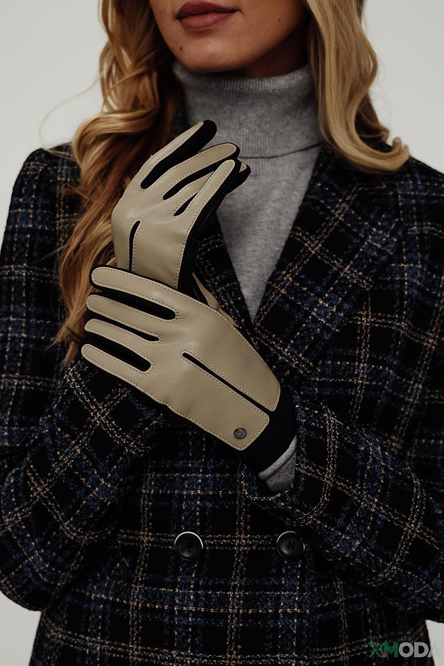 Перчатки имеют бежевый цвет с черными вставками, что делает их универсальным дополнением к различным образам. Классический крой и аккуратное исполнение подчеркивают изысканный вкус их обладательницы.