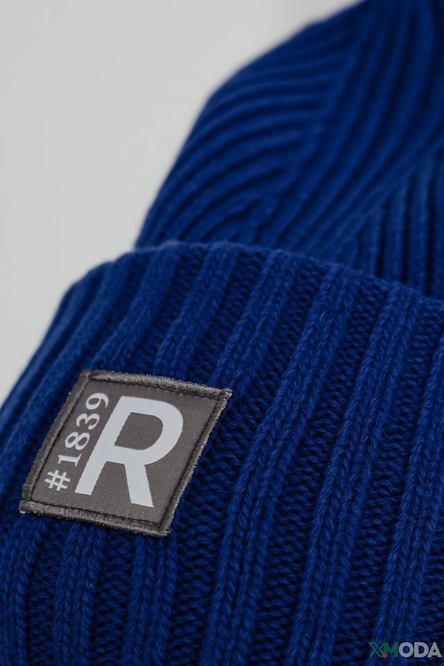 Шапка имеет классический дизайн и насыщенный синий цвет. На передней части изделия расположен логотип бренда Roeckl, выполненный в виде нашивки с буквой “R” и номером “1839”.