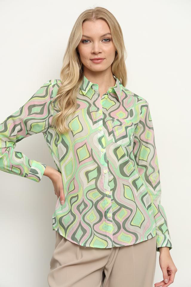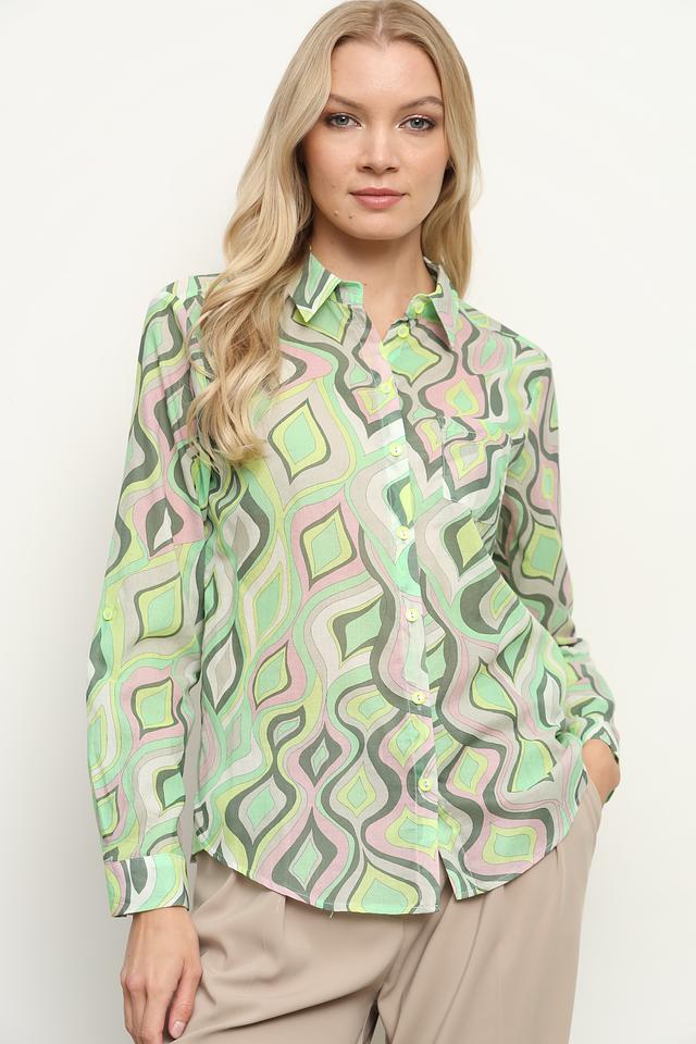 Женская рубашка Bianca зеленого цвета с оригинальным принтом в стиле ретро. Модель выполнена из 100% хлопка, обеспечивающего комфорт и воздухопроницаемость. Рубашка станет стильным дополнением к вашему гардеробу. Состав: хлопок 100%