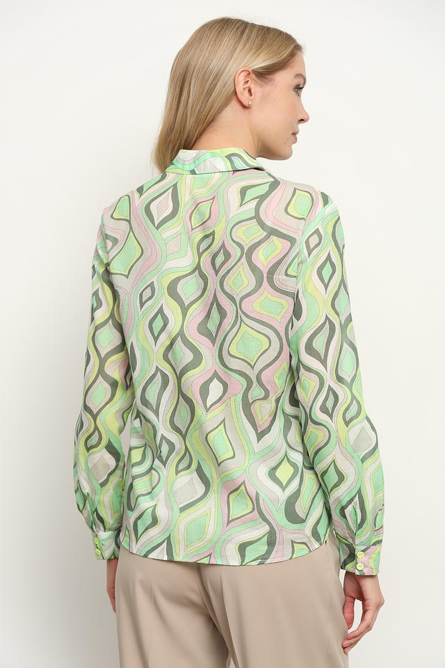 Рубашка имеет классический крой с длинными рукавами и отложным воротником. Её отличает уникальный принт, выполненный в ретро-стиле, сочетающий в себе оттенки зеленого, серого и розового.