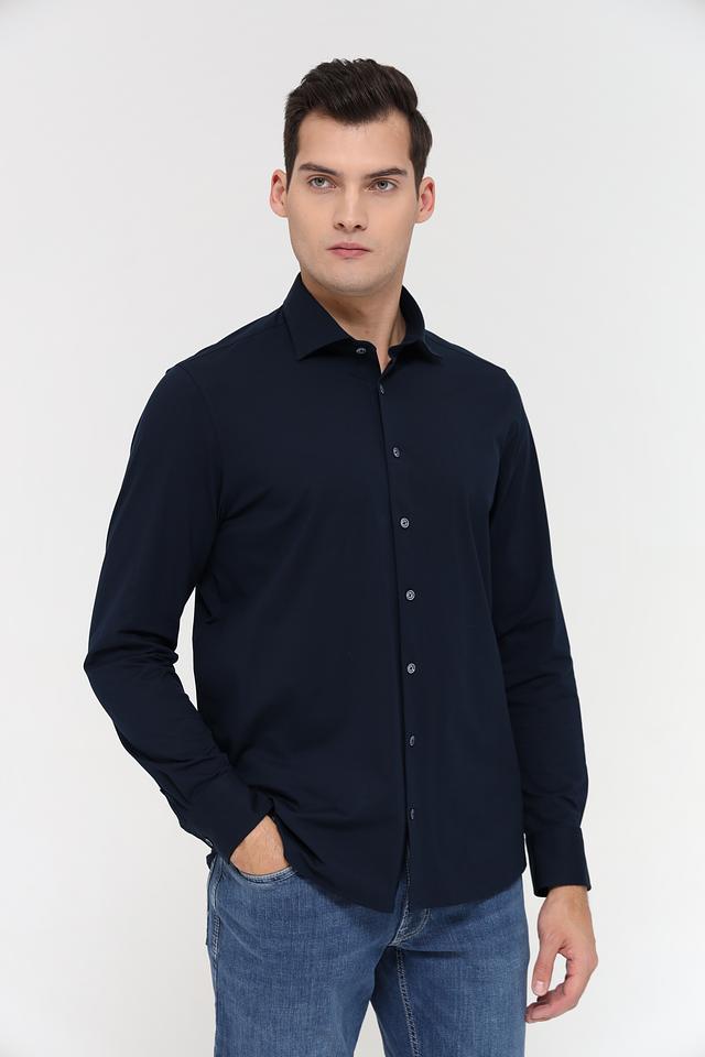 Рубашка имеет темно-синий цвет, который легко сочетается с различными элементами одежды. Застежка на пуговицах обеспечивает надежную фиксацию. Минималистичный дизайн делает эту рубашку универсальной и подходящей для любого случая. На внутренней стороне воротника расположена фирменная бирка Bugatti.