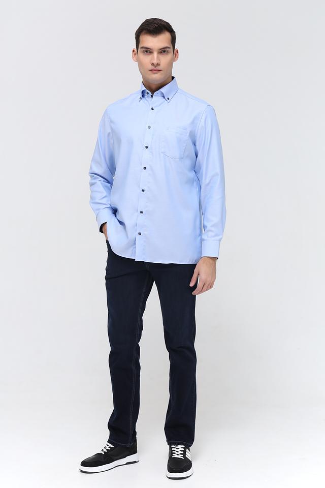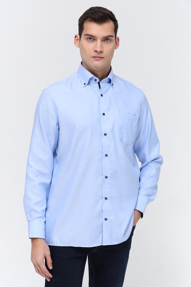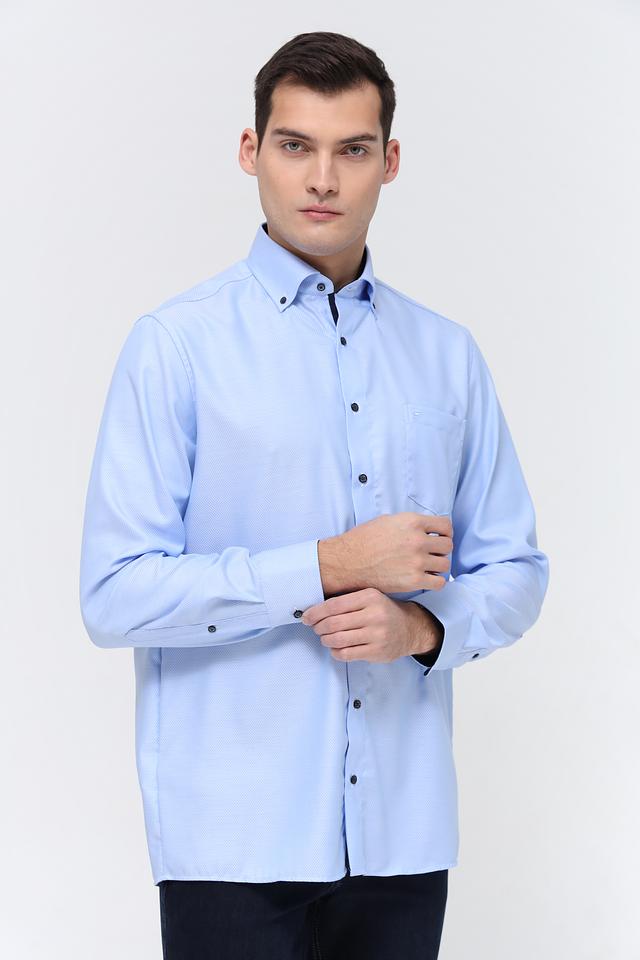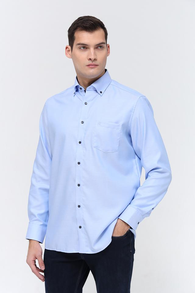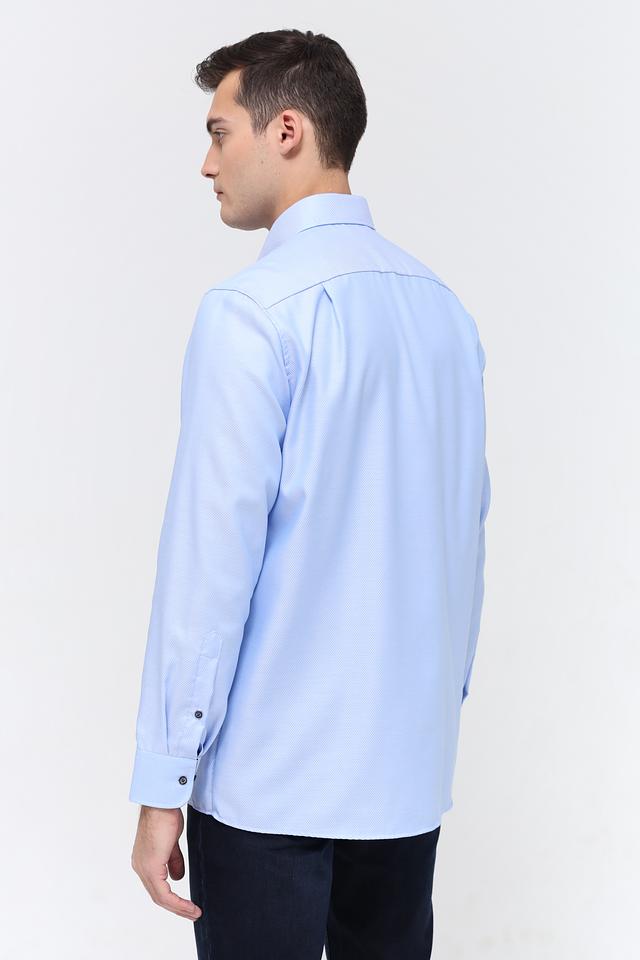 Рубашка имеет классический воротник, манжеты на пуговицах и нагрудный карман. Тёмные пуговицы контрастируют с голубым цветом ткани, добавляя рубашке элегантности. Текстура ткани с мелким рисунком придает рубашке дополнительный интерес.