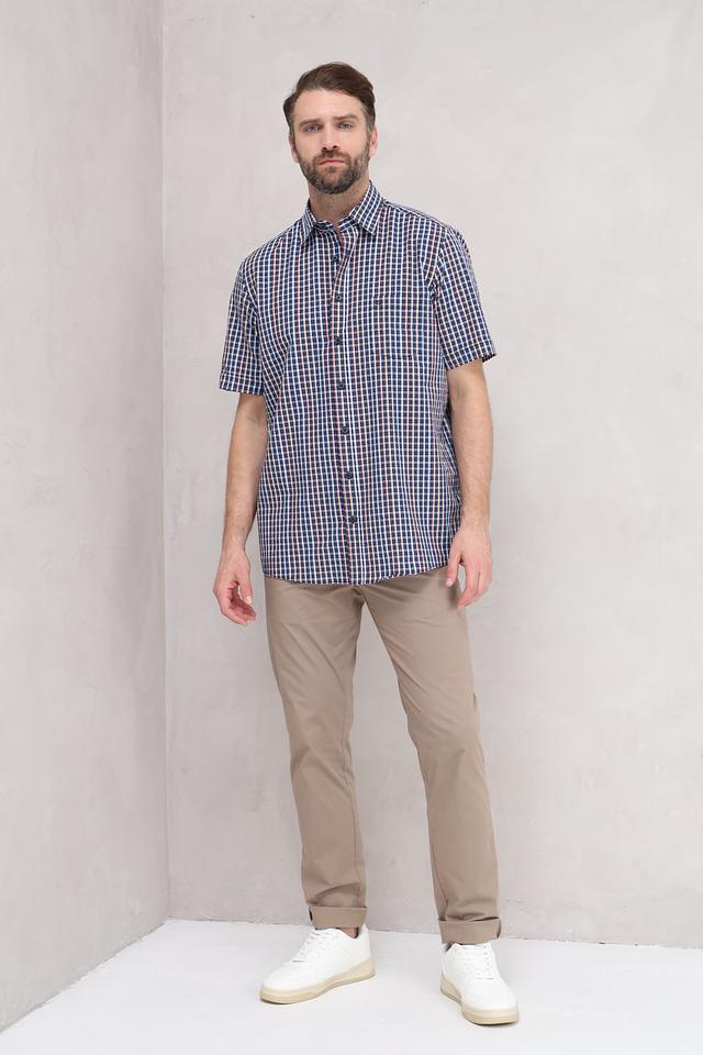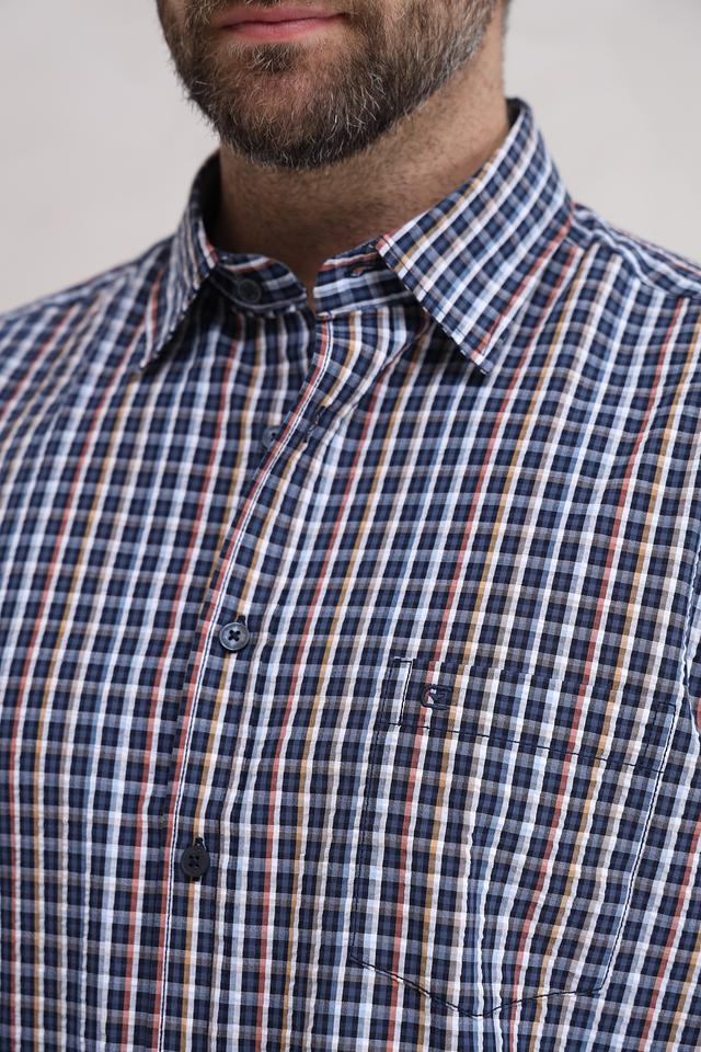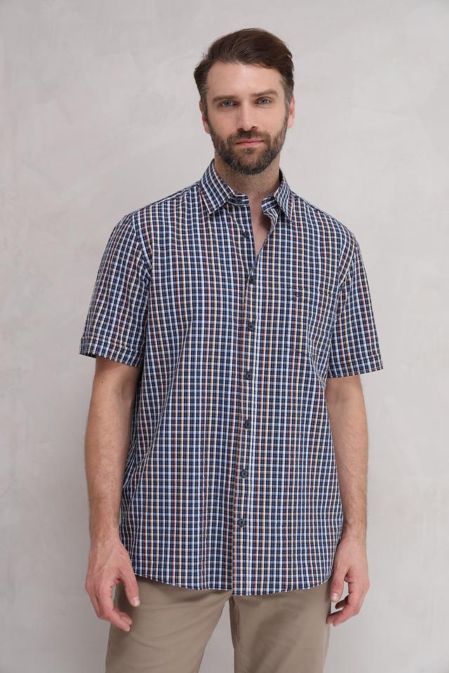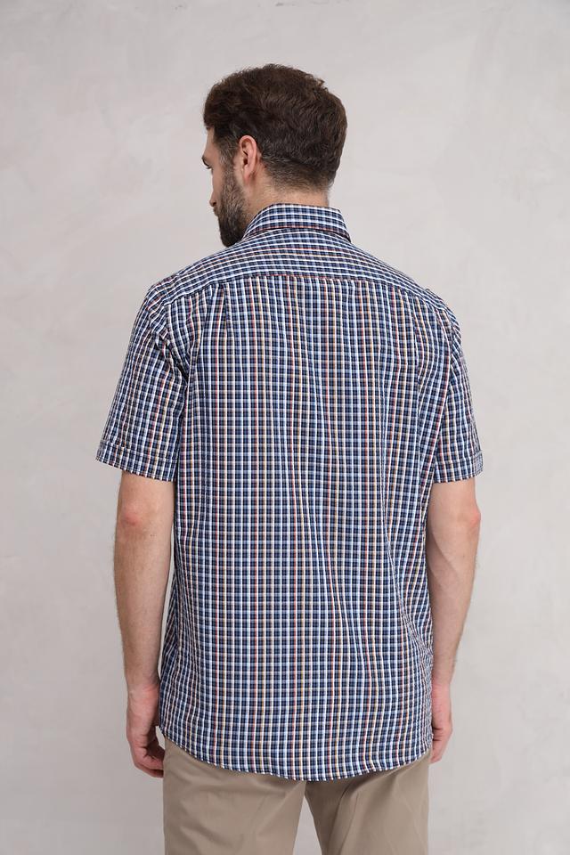 Рубашка имеет классический крой с короткими рукавами, что делает ее идеальной для повседневной носки. Особенностью модели является яркий клетчатый принт, сочетающий в себе оттенки синего, коричневого и белого. Воротник рубашки выполнен в классическом стиле.