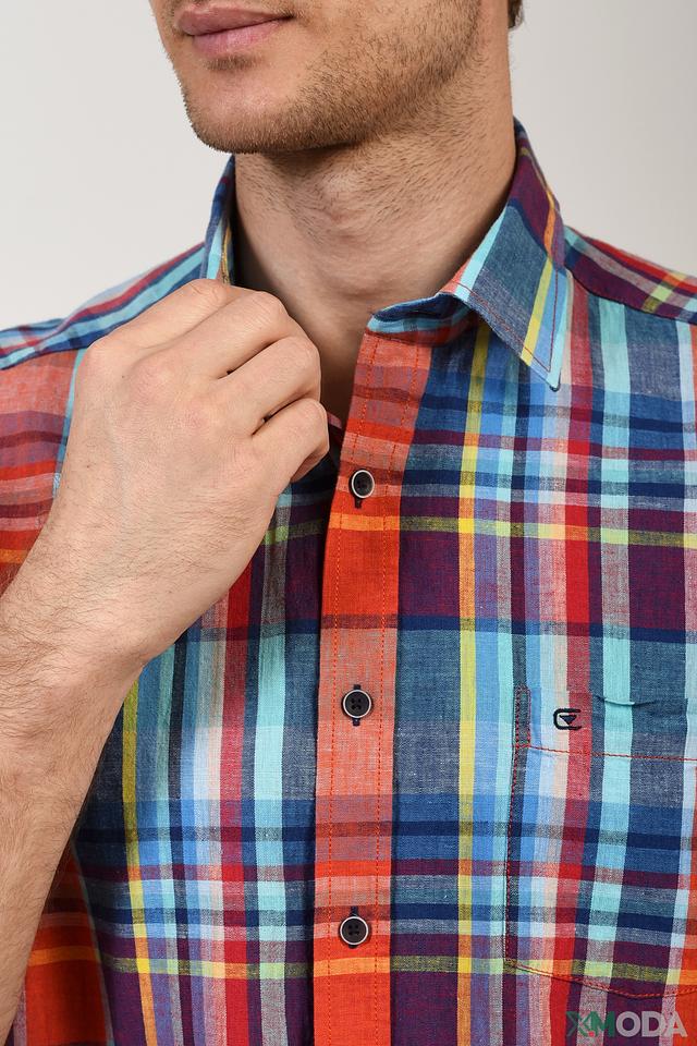 Рубашка имеет классический крой с короткими рукавами и стандартной застежкой на пуговицы. Яркий клетчатый принт в сочетании оранжевого, синего и красного цветов делает эту модель особенно привлекательной и универсальной. Она легко сочетается с шортами, брюками чинос или джинсами, создавая непринужденный и стильный образ.