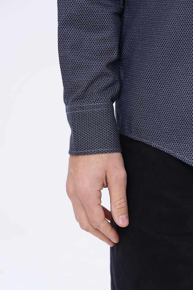 Рубашка имеет приталенный силуэт, который подчеркивает фигуру. Воротник классической формы, застежка на пуговицы. Мелкий геометрический рисунок придает рубашке элегантный и современный вид.