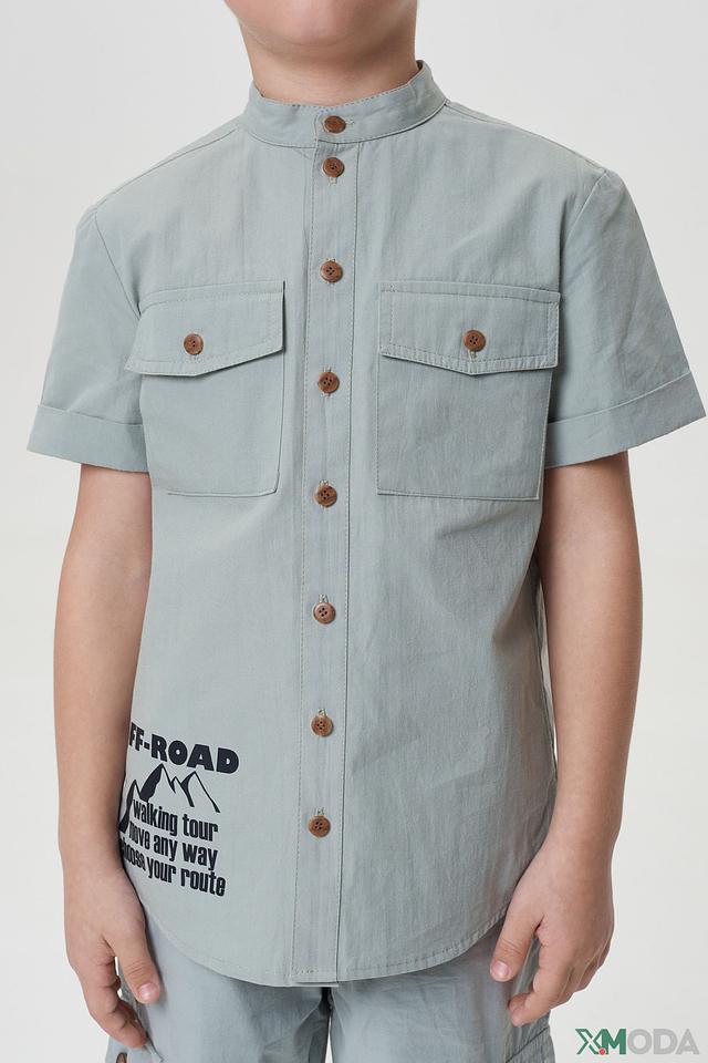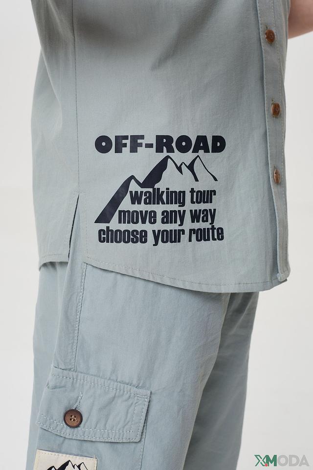 Рубашка имеет короткие рукава и удобный крой, не сковывающий движения. Воротник-стойка придает ей особый стиль. На передней части рубашки расположен яркий принт с изображением гор и надписью "OFF-ROAD", что подчеркивает ее активный характер.