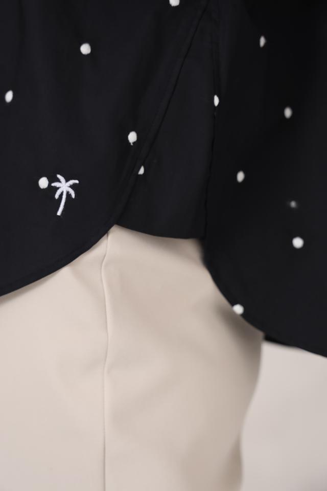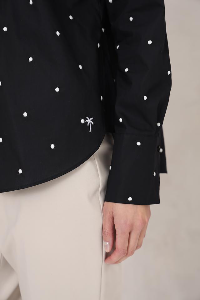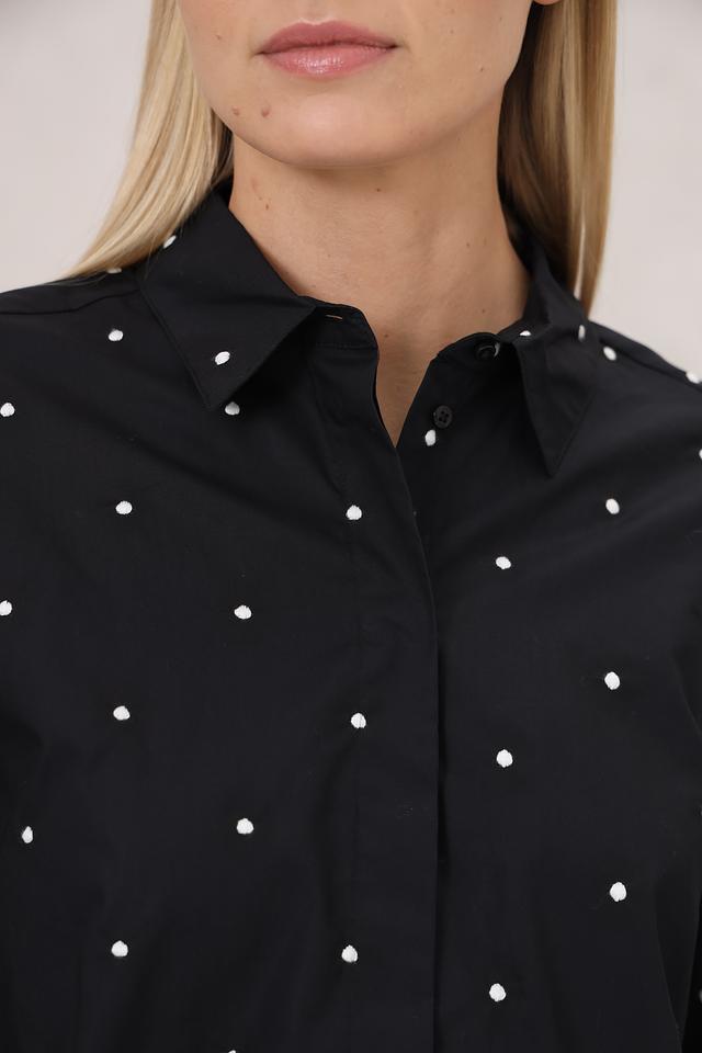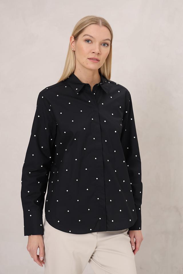 Основной цвет рубашки – чёрный, который украшен мелким белым горошком, создающим игривый и женственный образ. Рубашка имеет прямую посадку, обеспечивающую комфорт и свободу движений.