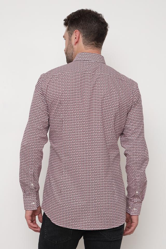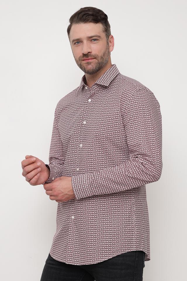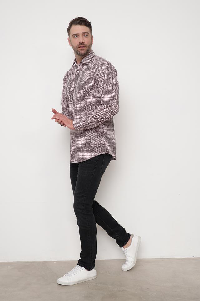 Рубашка имеет классический крой, который подходит для различных типов фигур. Особенностью модели является геометрический принт, выполненный в сочетании бордового и белого цветов на светло-сером фоне. Это придает рубашке современный и элегантный вид.