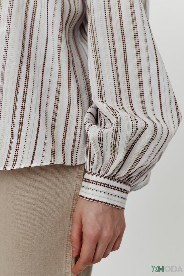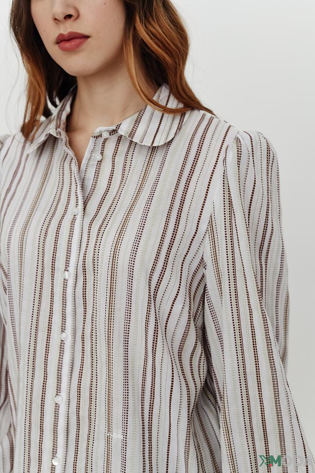 Рубашка имеет классический крой с отложным воротником и застежкой на пуговицы. Особый акцент сделан на рукавах-фонариках, которые придают образу романтичность и женственность. Модель выполнена из высококачественного 100% хлопка, что обеспечивает комфорт в носке и приятные тактильные ощущения.