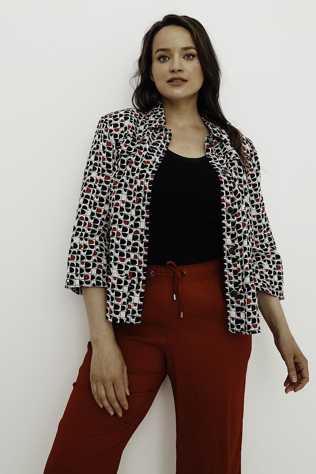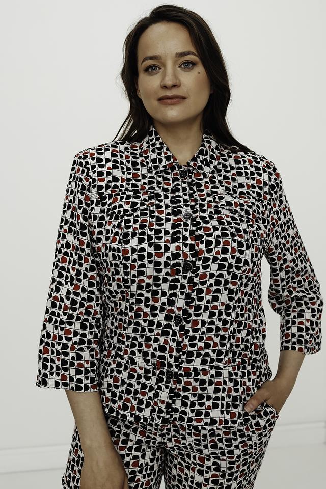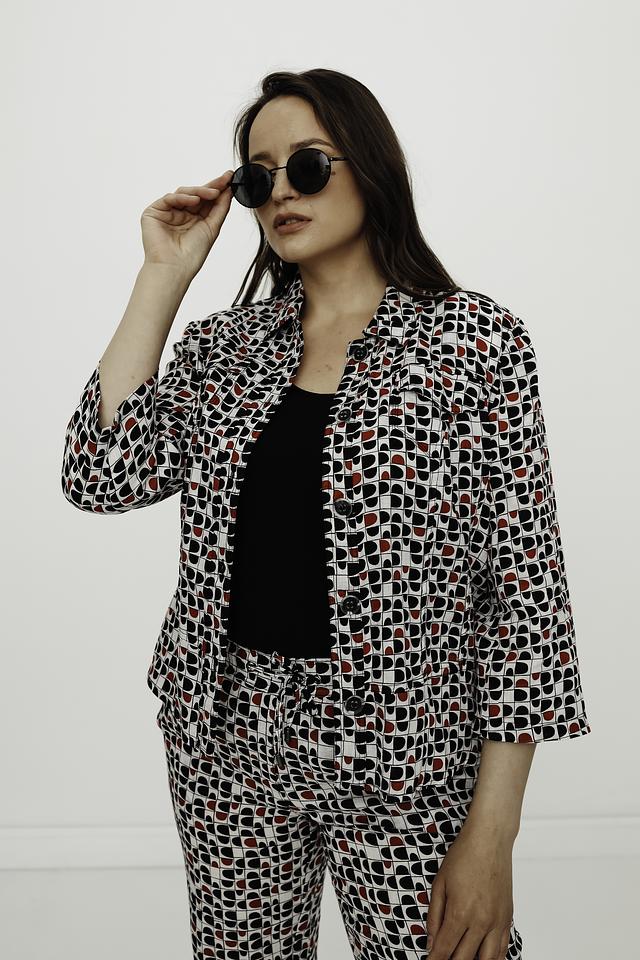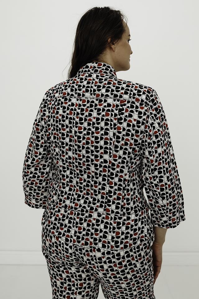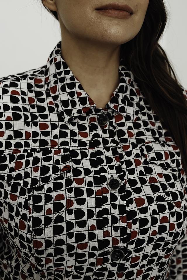 Рубашка имеет прямой крой, воротник и застёжку на пуговицы. Её отличает яркий геометрический принт, сочетающий в себе белый фон и узоры в чёрном и красном цветах. Рукава рубашки – три четверти.
