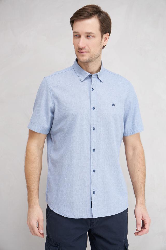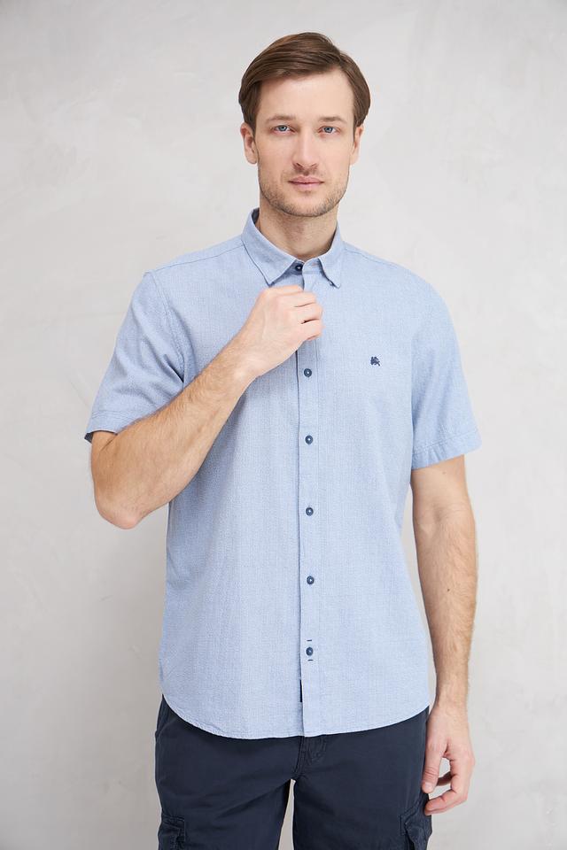 Рубашка имеет классический крой, подходящий для различных типов фигур. Голубой цвет с мелким рисунком придает ей свежий и современный вид. На груди расположена небольшая вышивка с логотипом бренда.