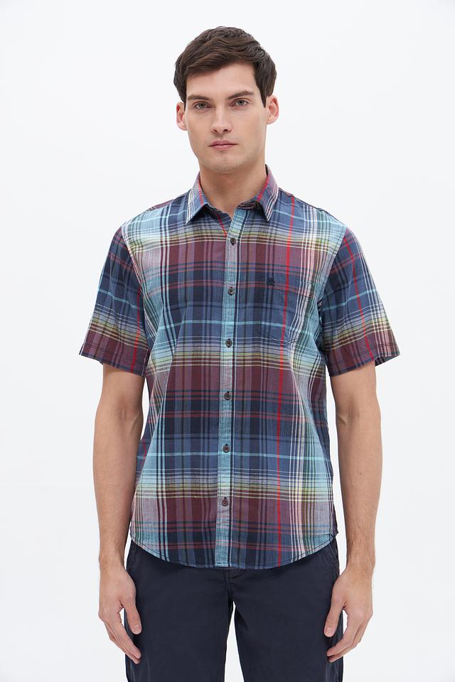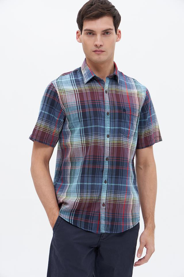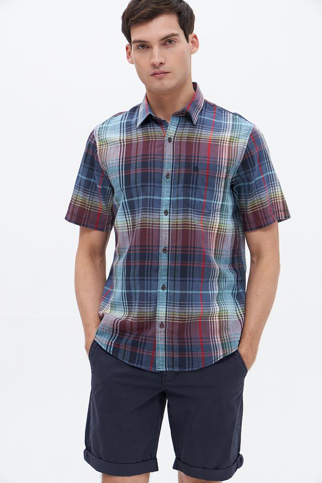 Мужская рубашка Lerros с коротким рукавом выполнена в клетку. Модель с классическим кроем и застежкой на пуговицы, изготовлена из хлопка с добавлением льна. Состав: хлопок 71%, лен 29%