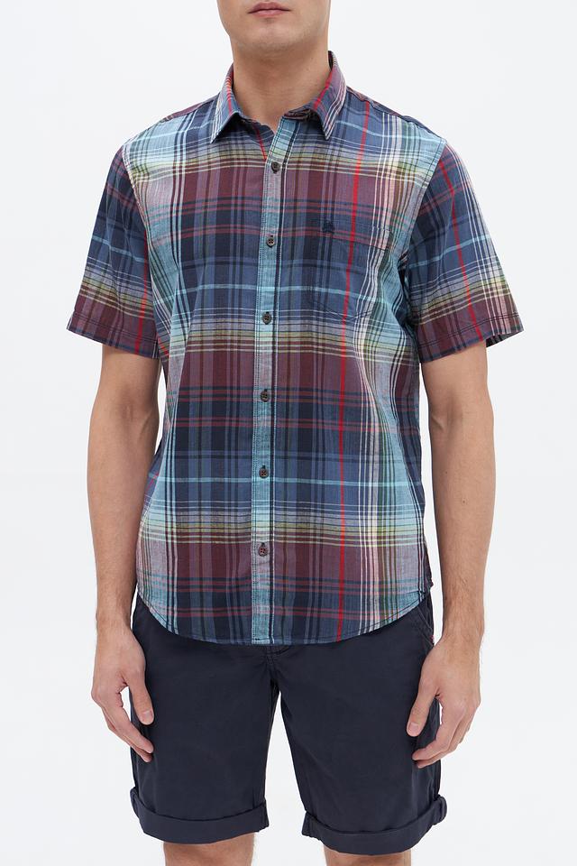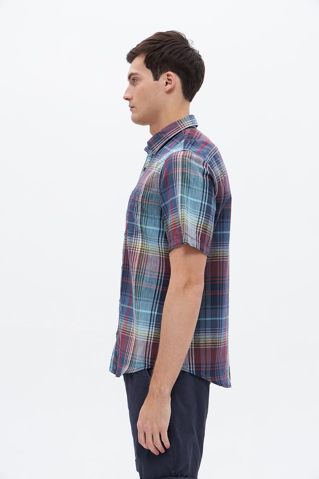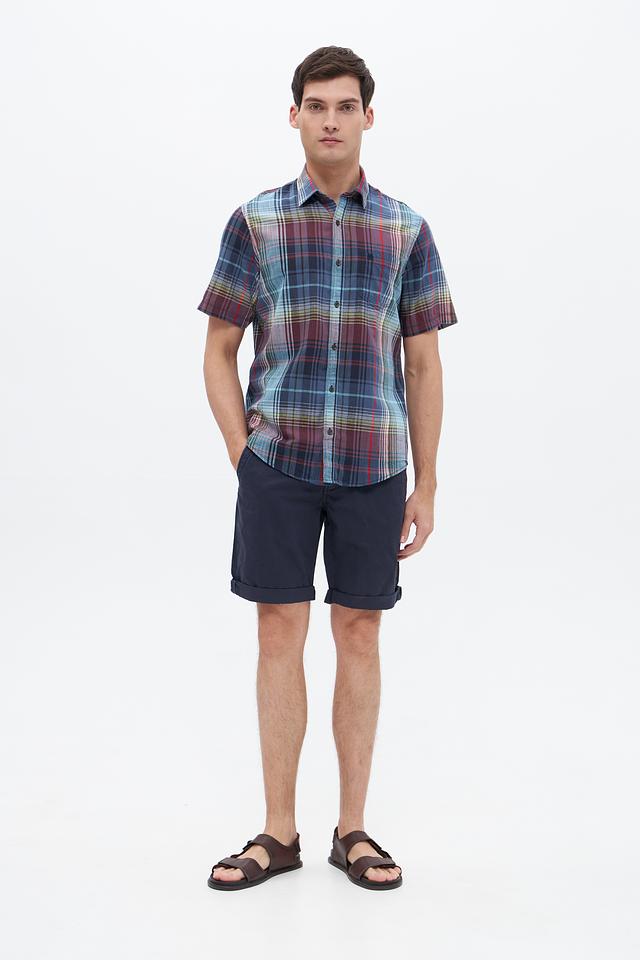 Застежка на пуговицы обеспечивает надежную фиксацию, а короткие рукава делают рубашку идеальным выбором для теплой погоды. Состав ткани: хлопок 71%, лен 29%.