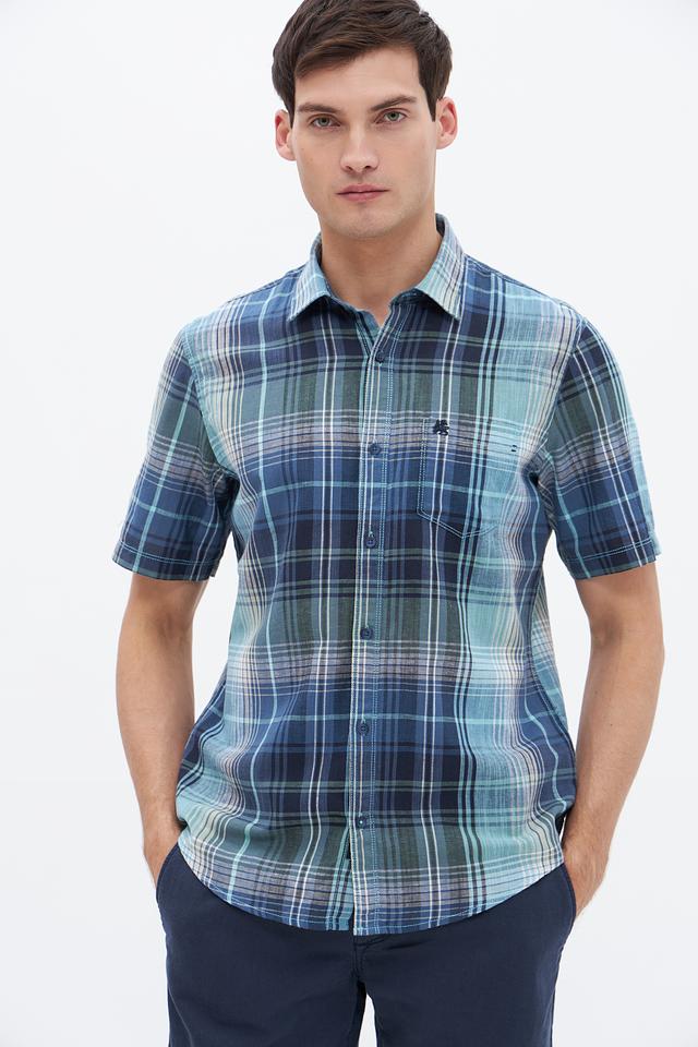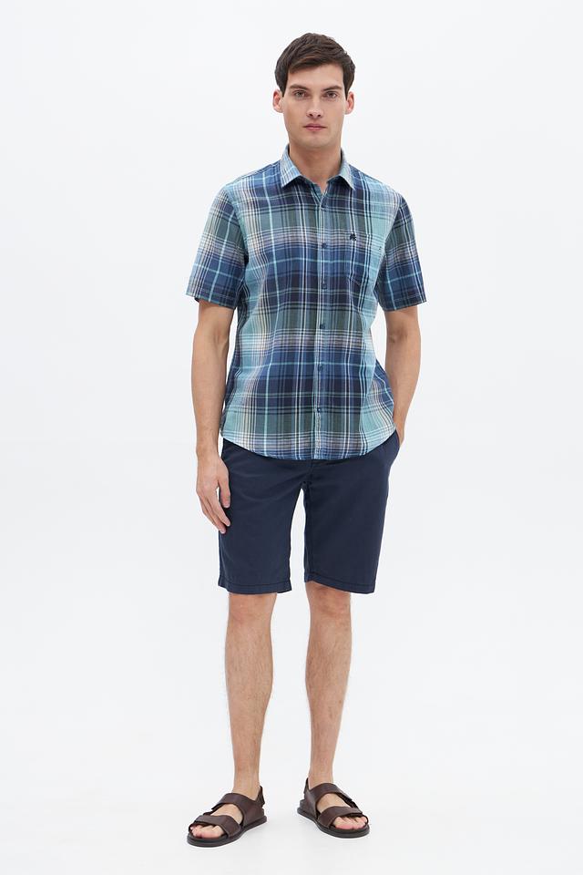 Рубашка имеет классический крой, короткие рукава и традиционный воротник. Особенностью модели является яркий клетчатый принт в сине-зелёных тонах, который придаёт ей свежий и современный вид. Нагрудный карман добавляет функциональности и акцентирует внимание на деталях.