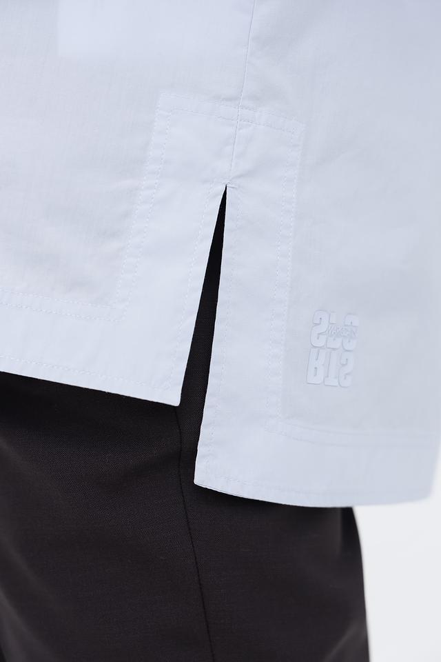 Рубашка имеет классический крой с длинными рукавами и отложным воротником. На спине расположена декоративная вставка в виде светлого прямоугольника, добавляющая оригинальности. Прямой силуэт обеспечивает свободу движений и подходит для различных типов фигур.