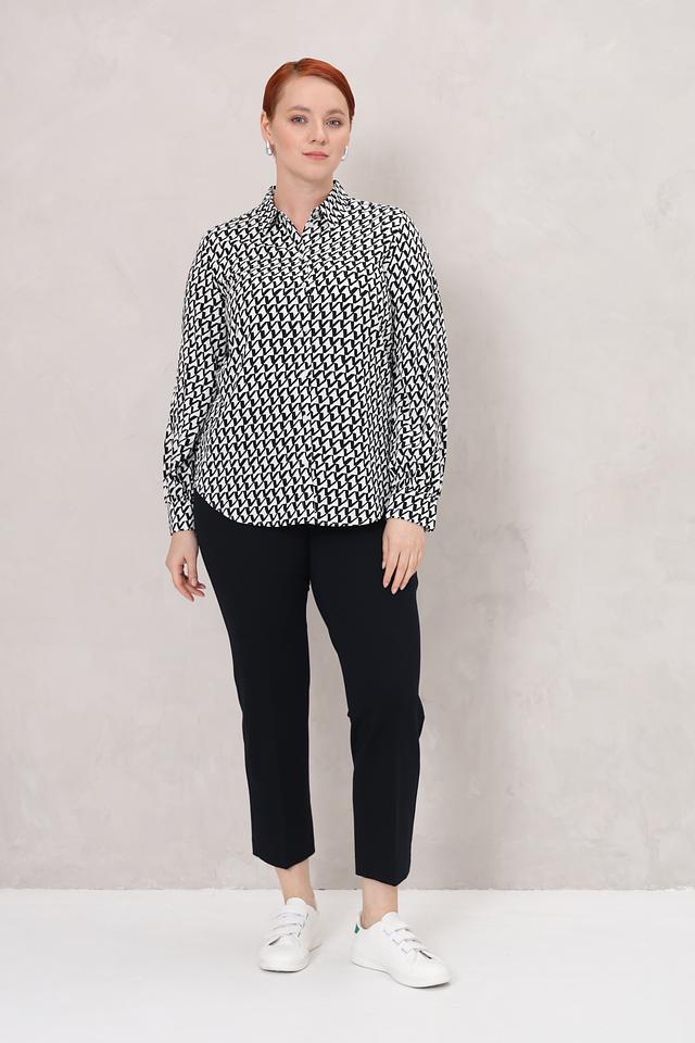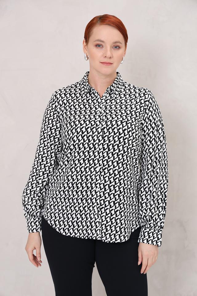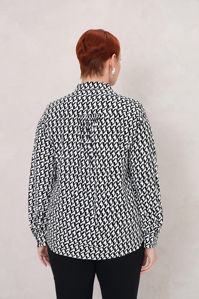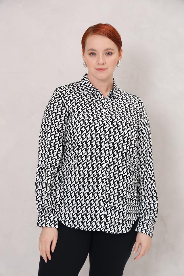 Основной цвет рубашки – белый, но её украшает эффектный геометрический принт чёрного цвета, создающий контрастный и запоминающийся образ. Рубашка выполнена из 100% вискозы, что делает её приятной к телу и обеспечивает комфорт при ношении.