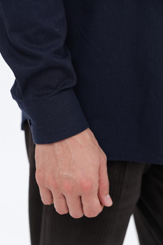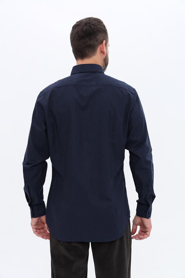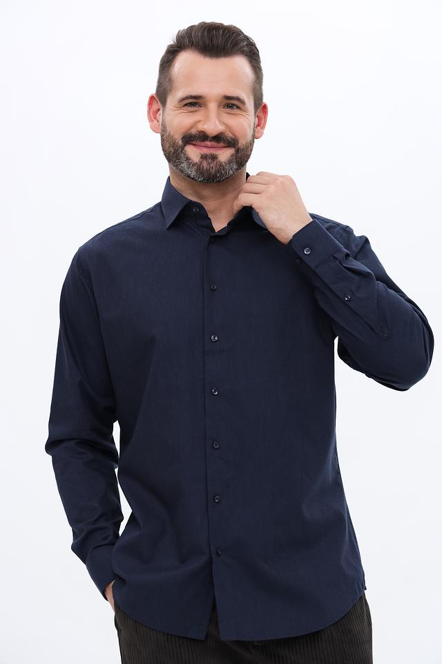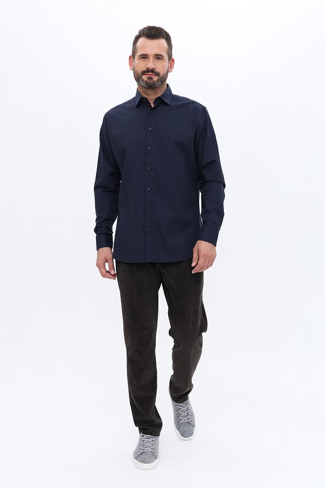 Рубашка имеет длинные рукава, стандартный воротник и застежку на пуговицы. Тёмно-синий цвет делает её универсальной и подходящей для различных случаев – от деловых встреч до повседневной носки. Прямой крой обеспечивает свободу движений и комфортную посадку по фигуре.