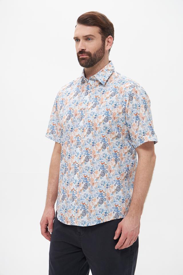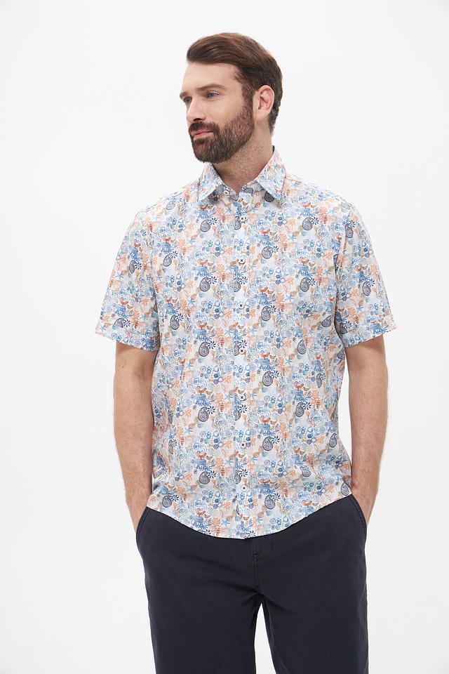 Особенностью данной модели является яркий и оригинальный цветочный принт, выполненный в голубых, оранжевых и белых тонах. Такой рисунок добавит вашему образу свежести и индивидуальности. Классический крой рубашки подходит для различных типов фигуры и легко сочетается с другими элементами гардероба.