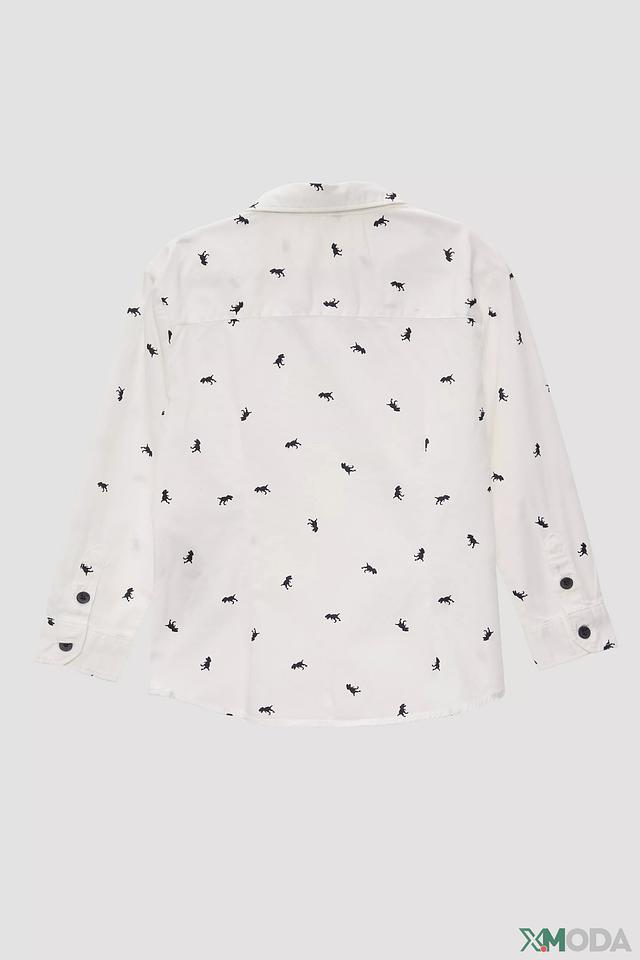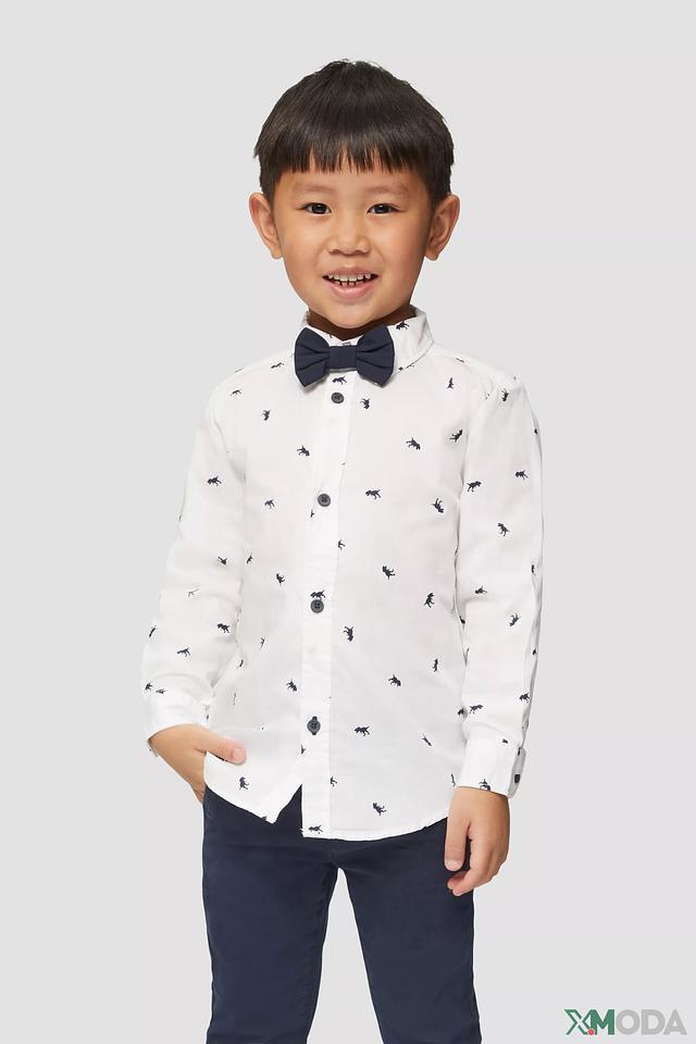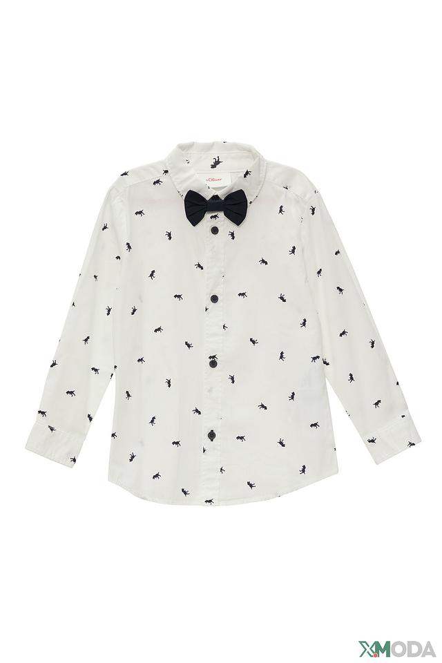 Белая рубашка от s.Oliver для мальчиков, украшенная мелким принтом в виде зверюшек и дополнена тёмно-синей бабочкой. Стильный и нарядный образ для особых случаев. Состав: хлопок 97%, эластан 3%