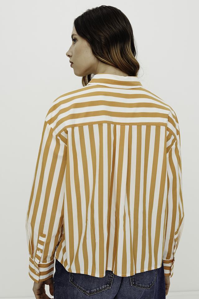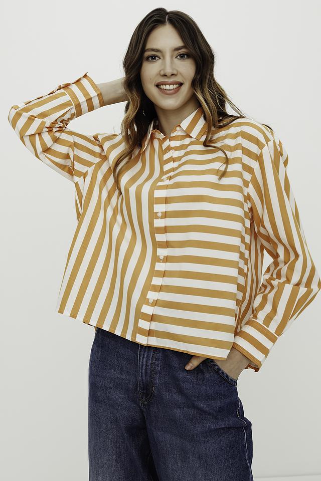 Рубашка имеет классический крой с длинными рукавами и воротником. Особенностью модели является яркий оранжевый цвет в сочетании с белыми полосками, создающими стильный и динамичный образ.