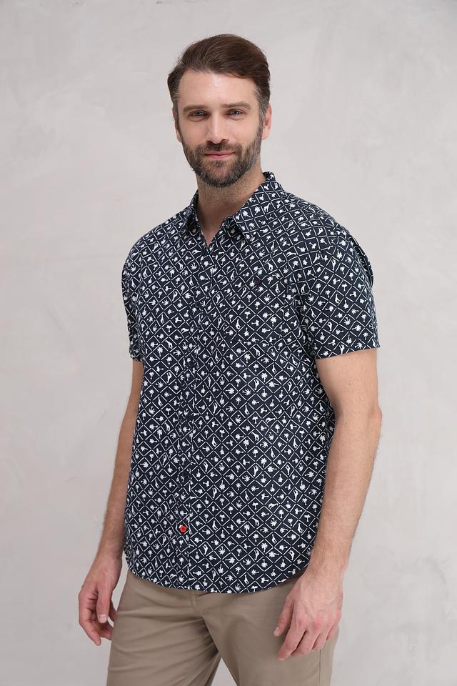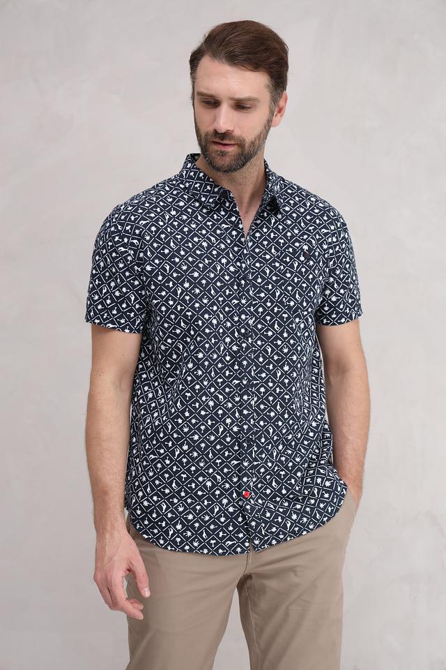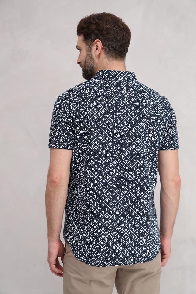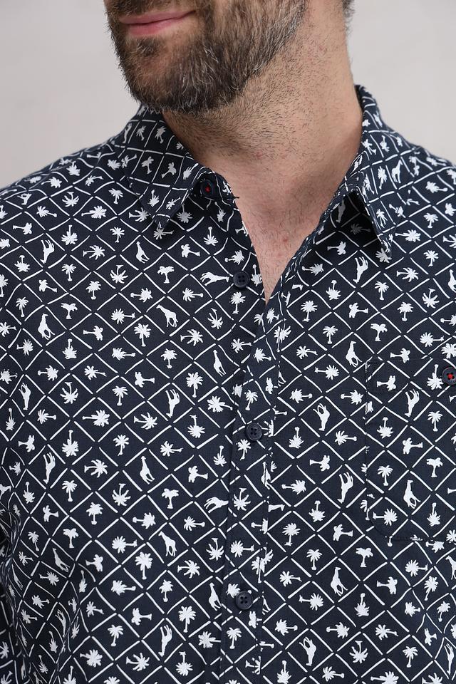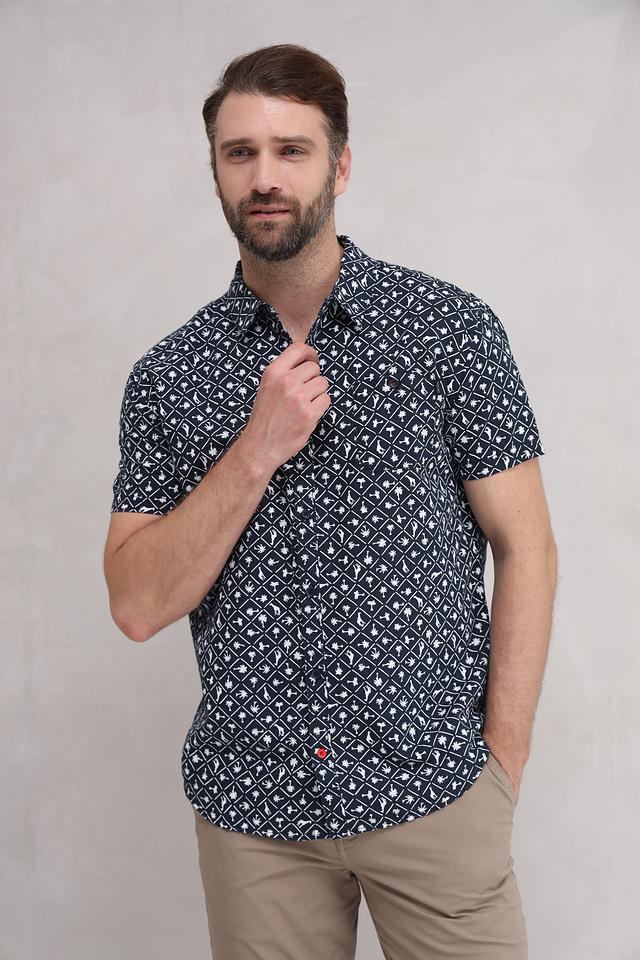 Мужская рубашка Time Zone темно-синего цвета с коротким рукавом и оригинальным геометрическим принтом. Изготовлена из натурального смесового материала, обеспечивающего комфорт и воздухопроницаемость. Состав: лен 55%, хлопок 45%