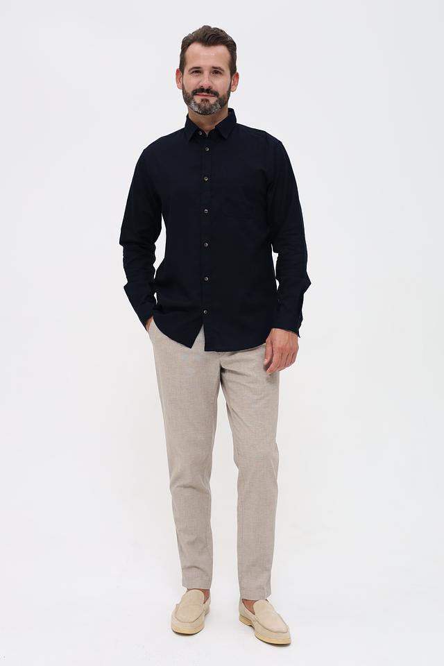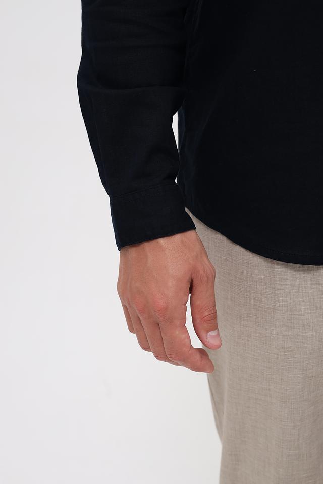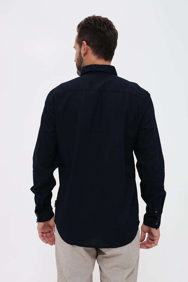 Рубашка имеет длинные рукава и стандартную посадку. Она изготовлена из высококачественного материала, сочетающего в себе 55% льна и 45% хлопка, что обеспечивает комфорт в носке и хорошую воздухопроницаемость. Ткань приятна к телу и не вызывает раздражения.