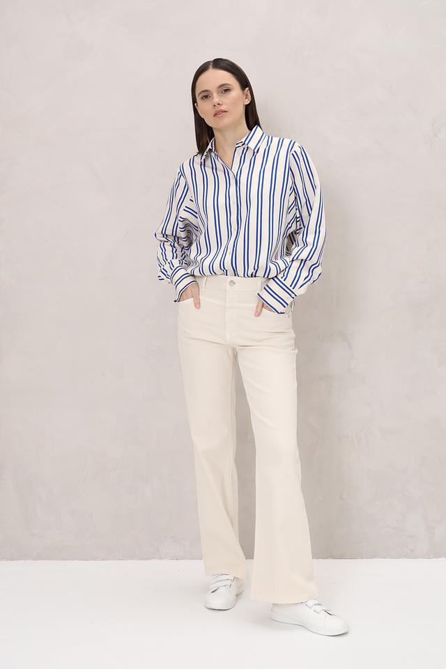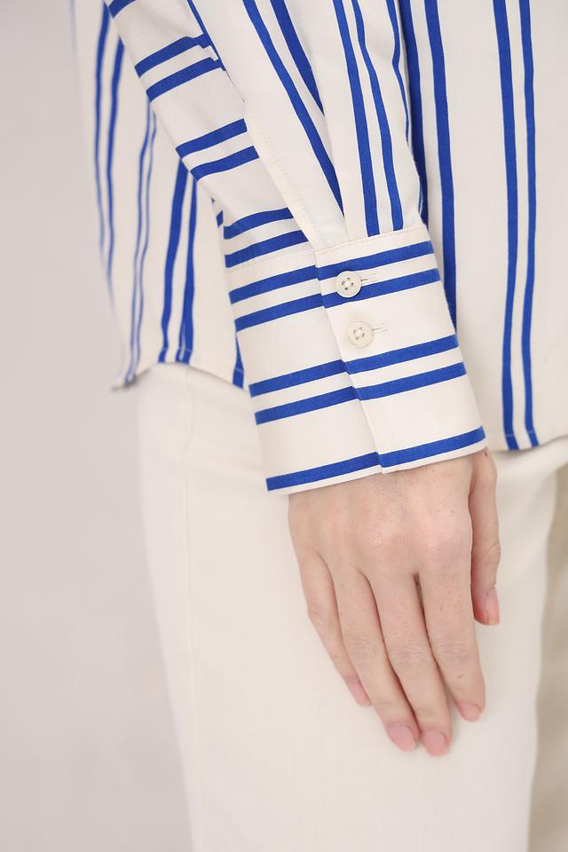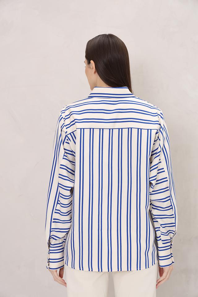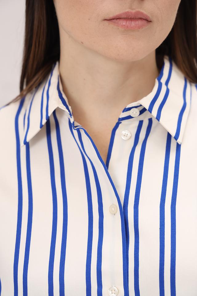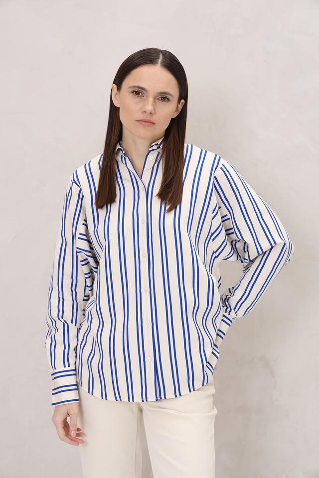 Основной цвет рубашки – белый, дополненный вертикальными полосами насыщенного синего цвета. Такое сочетание делает ее универсальной и подходящей для различных образов.