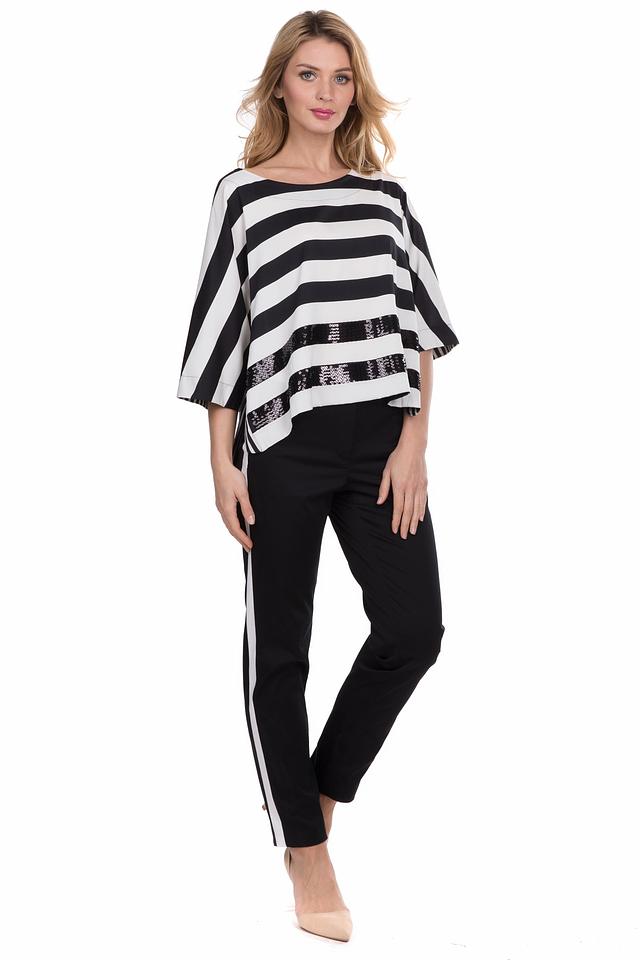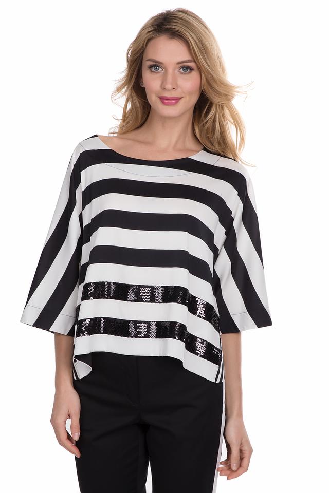 Особенностью данной модели является декор из пайеток, расположенных на полосах, что придает блузе праздничный и нарядный вид. Свободный крой обеспечивает комфорт в носке, а рукава 3/4 делают её подходящей для любого времени года.