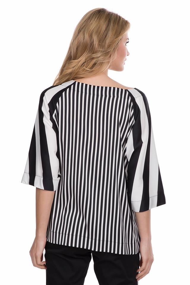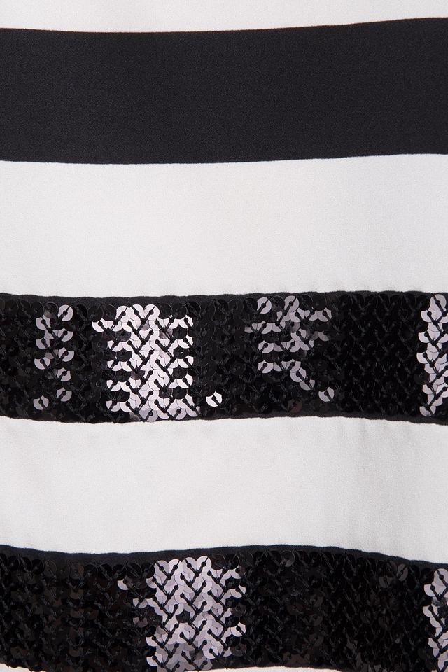 Блуза Sai-Ku чёрно-белого цвета с полосатым принтом и декоративными пайетками добавит образу лёгкости и оригинальности. Модель свободного кроя с рукавами 3/4 идеально подойдёт для создания повседневных и вечерних образов. Состав: полиэстер 100%