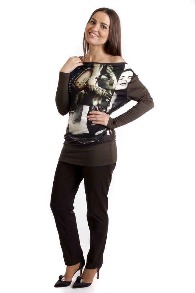 Основной цвет блузы – коричневый, который служит идеальным фоном для эффектного принта с изображением гитары и музыкантов. Принт выполнен в различных оттенках серого, белого и черного, создавая контрастный и запоминающийся образ.