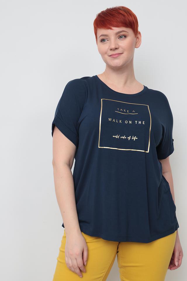 Женская футболка Samoon темно-синего цвета с оригинальным золотистым принтом. Модель выполнена из мягкой вискозы с добавлением эластана, обеспечивающего комфортную посадку. Идеальный выбор для создания повседневных образов. Состав: вискоза 95%, эластан 5%