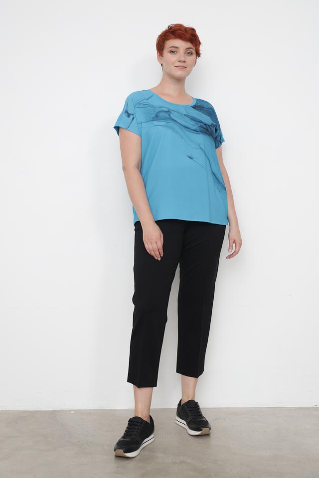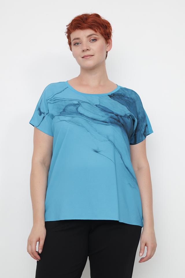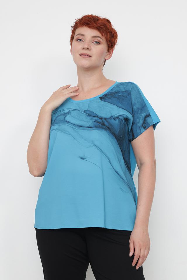Особенностью данной модели является яркий принт, имитирующий мраморные разводы. Принт расположен на верхней части блузы, создавая интересный акцент. Крой блузы свободный, слегка заниженная линия талии, что делает ее удобной в носке и подходящей для разных типов фигур.