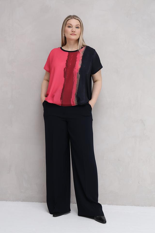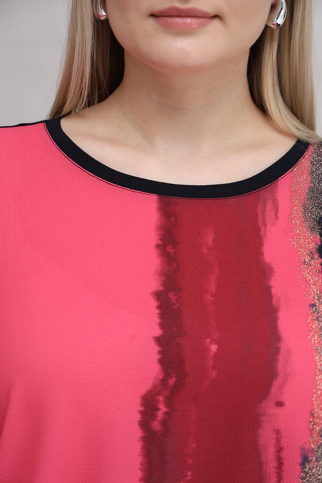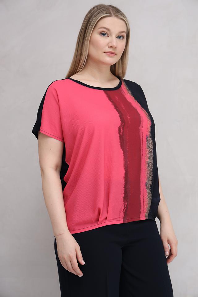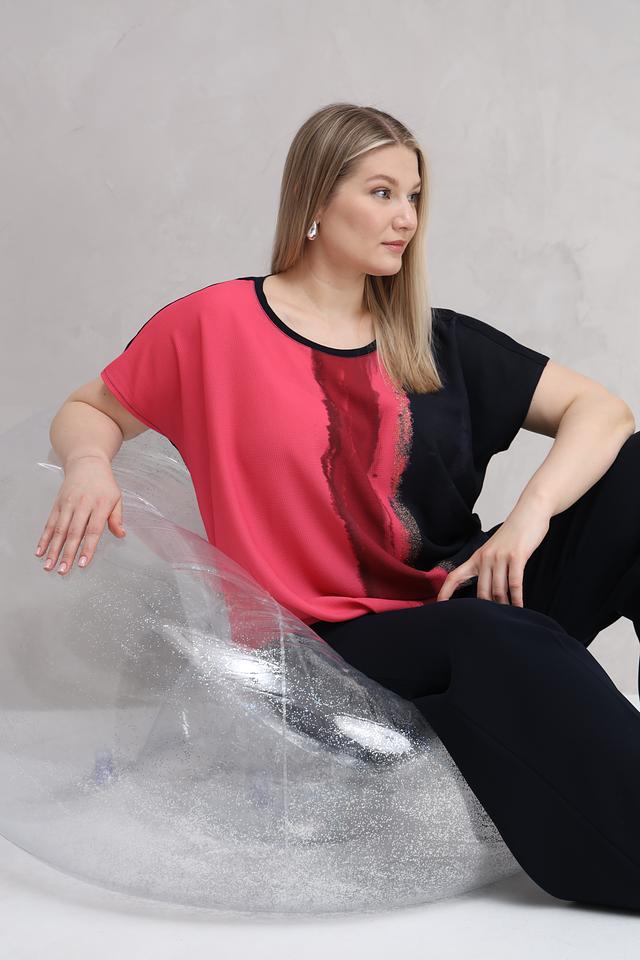 Особенностью данной модели является оригинальный принт в виде вертикальных мазков кораллового и черного цветов. Этот принт добавляет блузе изысканности и индивидуальности. Состав: 92% вискоза, 8% эластан.