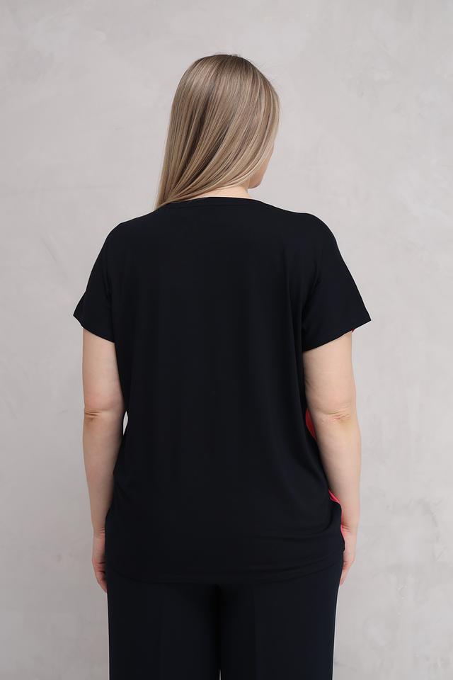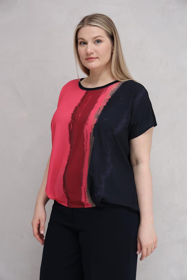 Блуза Samoon кораллово-черного цвета с оригинальным принтом в виде вертикальных мазков. Модель свободного кроя с короткими рукавами и округлым вырезом горловины выполнена из мягкой и приятной к телу вискозы с добавлением эластана. Состав: вискоза 92%, эластан 8%