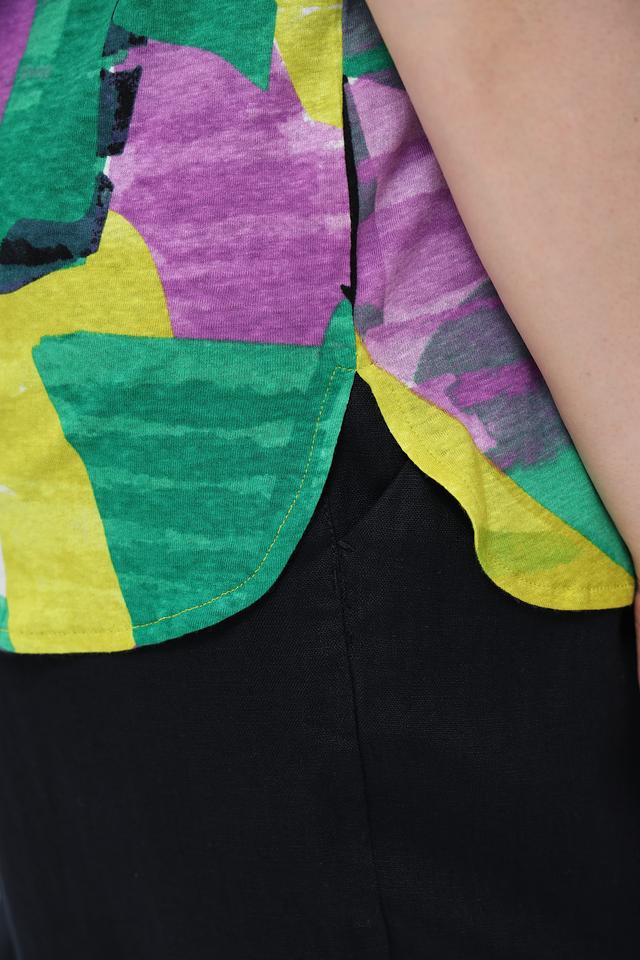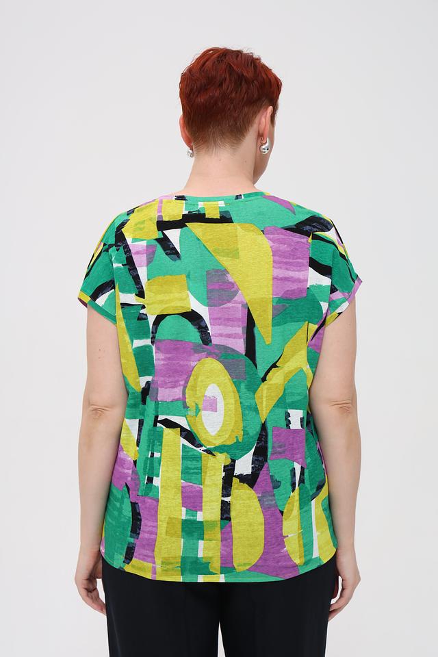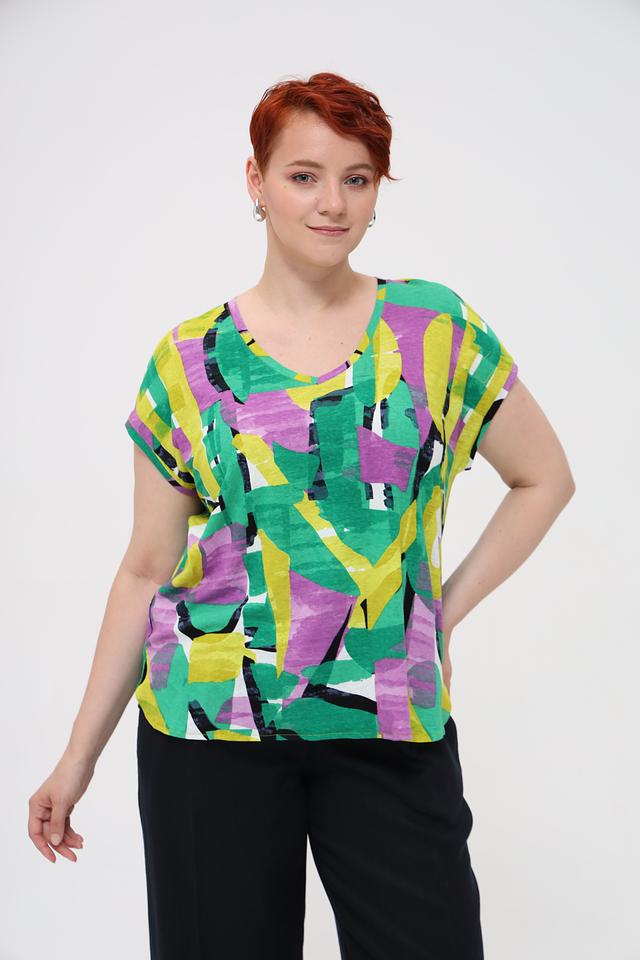 Футболка имеет свободный крой, который не сковывает движений и позволяет коже дышать. V-образный вырез подчеркивает линию шеи и декольте, придавая образу женственность. Яркий абстрактный принт в зеленых, фиолетовых и желтых тонах делает эту футболку уникальной и привлекательной.