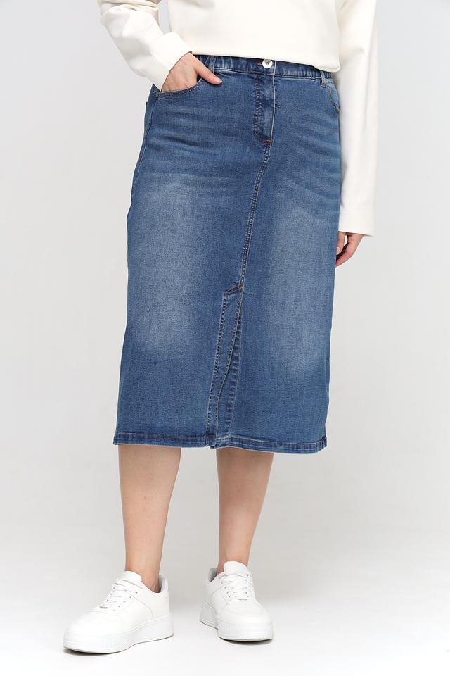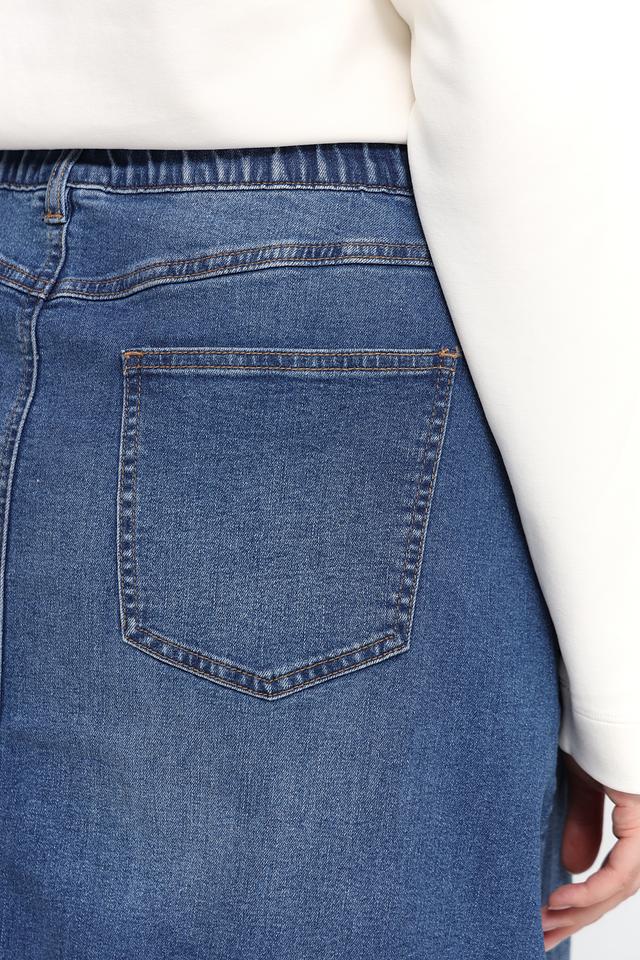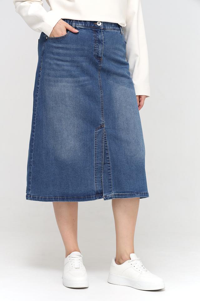 Джинсовая юбка Samoon миди длины выполнена в классическом синем цвете. Модель с эластичным поясом и небольшим разрезом спереди обеспечит комфорт и свободу движений. Состав: хлопок 72%, переработ.полиэстер 27%, эластан 1%