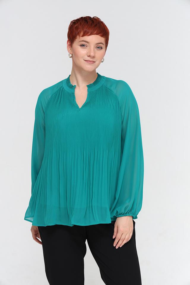 Блуза имеет приятный изумрудный цвет и эффектную плиссированную текстуру, которая добавляет образу изысканности. V-образный вырез и длинные рукава делают ее универсальной для различных случаев.
