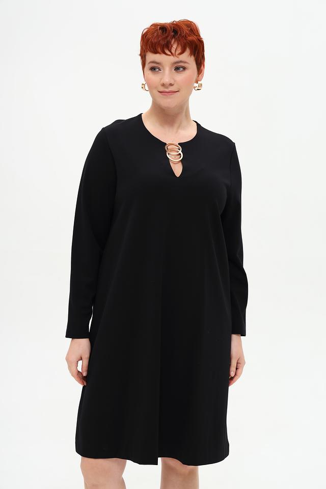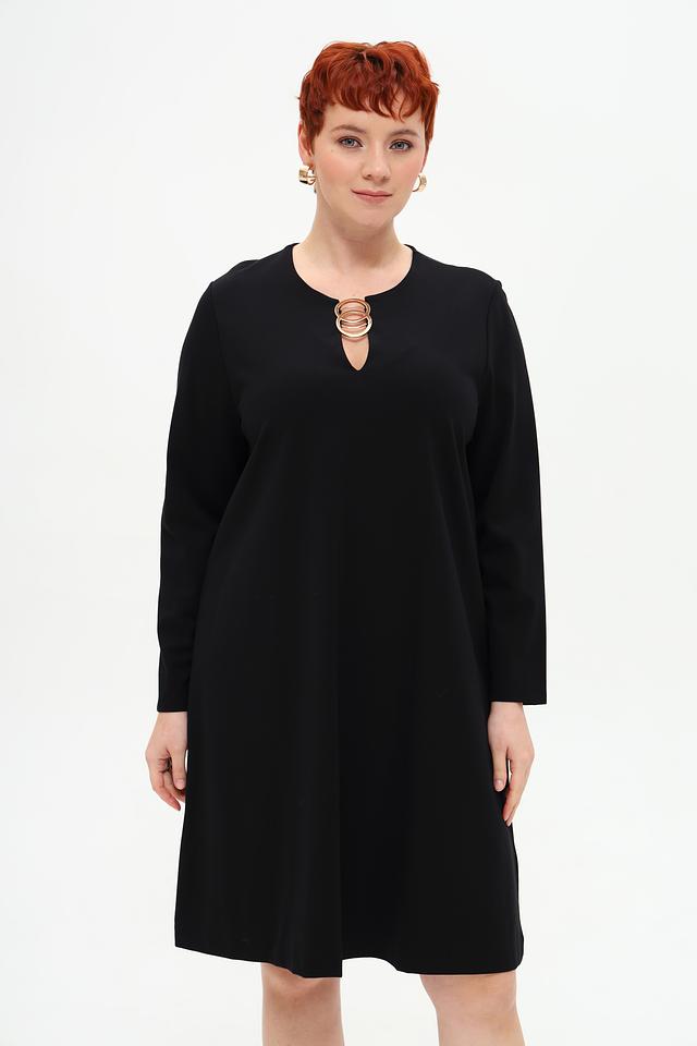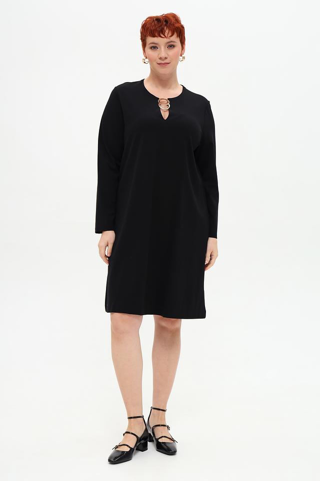 Модель имеет прямой силуэт, длину до колена и длинные рукава, что делает его подходящим для повседневной носки и особых случаев. Оригинальный вырез на горловине, украшенный металлическим кольцом, добавляет платью изюминку и привлекает внимание.