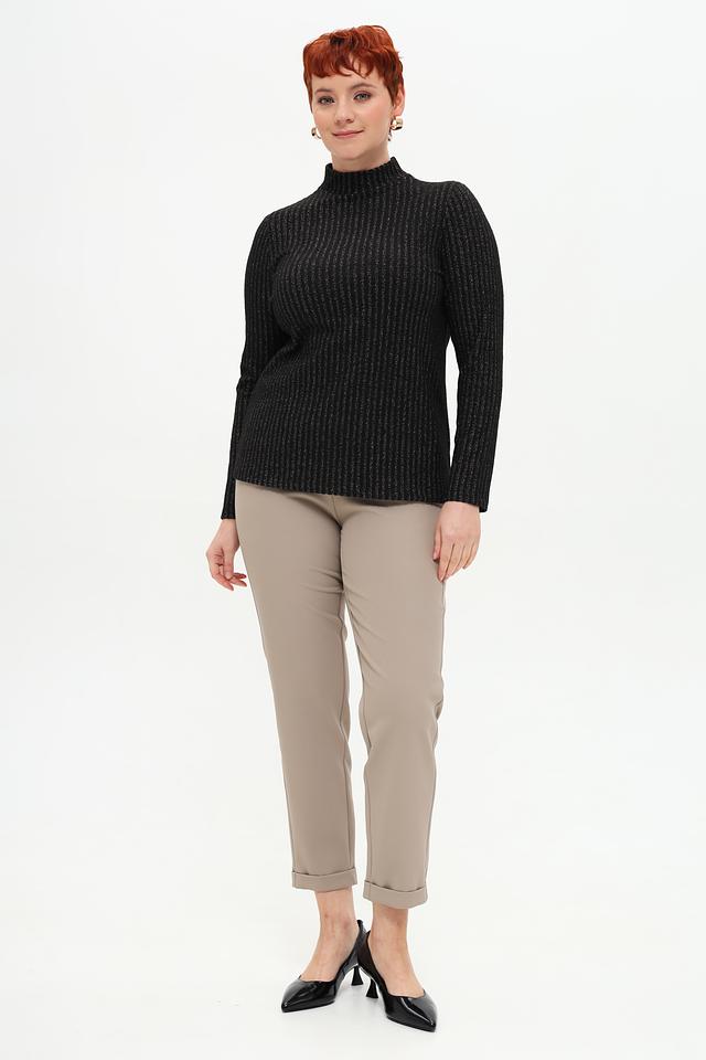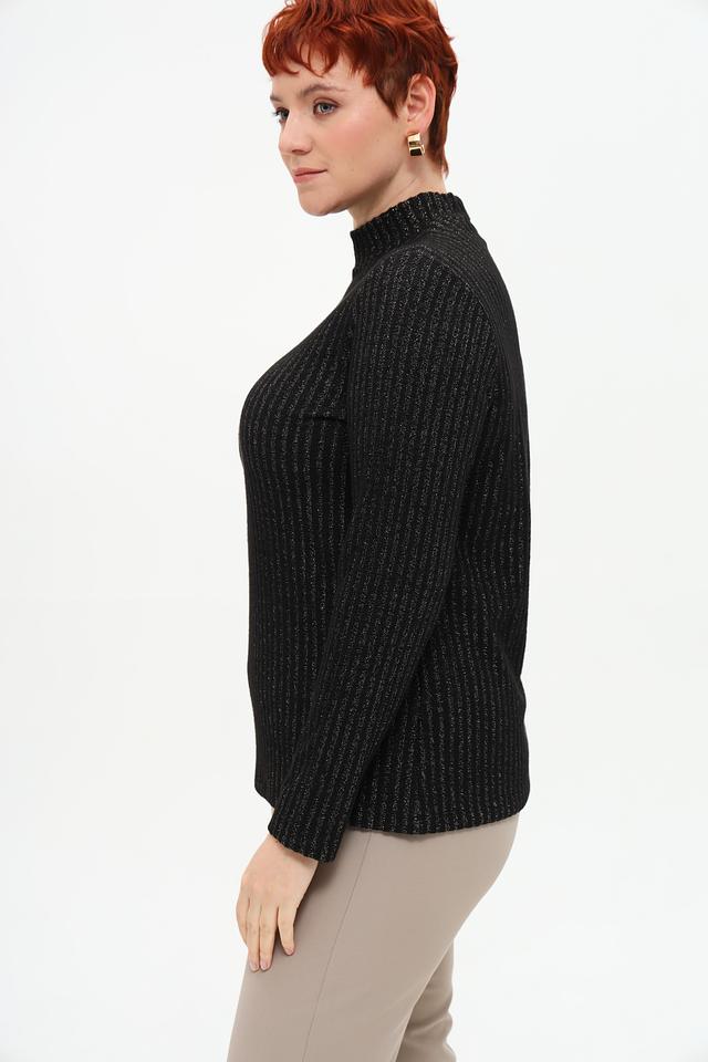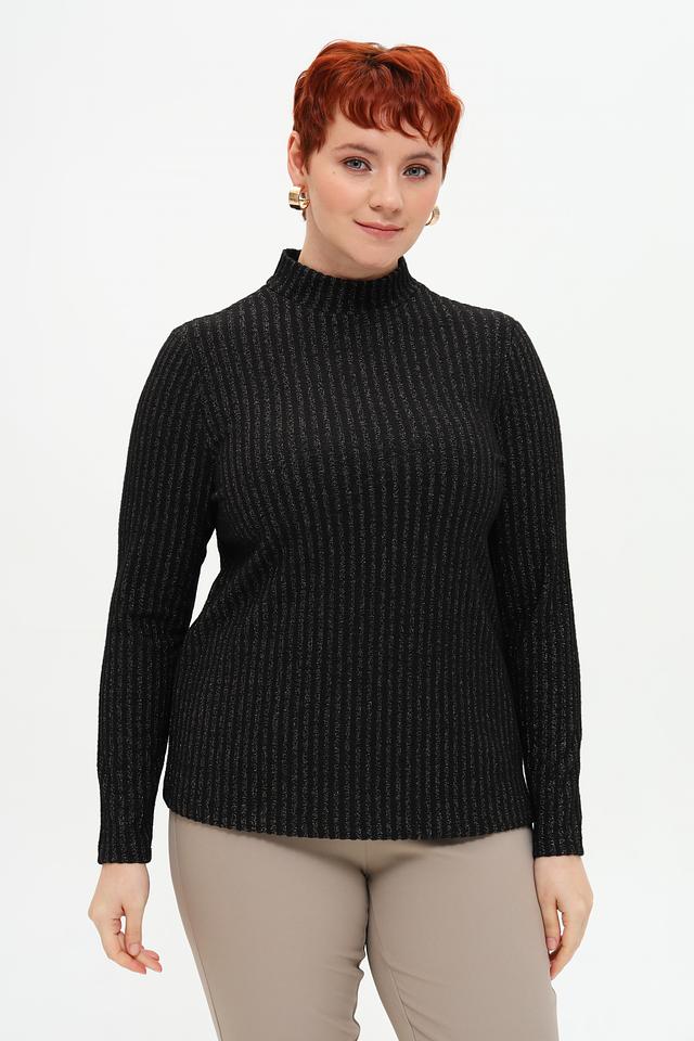 Женский пуловер Samoon чёрного цвета с вертикальными полосками и добавлением металлизированной нити. Изготовлен из мягкого и приятного к телу сочетания полиэстера, вискозы и эластана. Состав: полиэстер 55%, вискоза 25%, метализ.нить 15%, эластан 5%