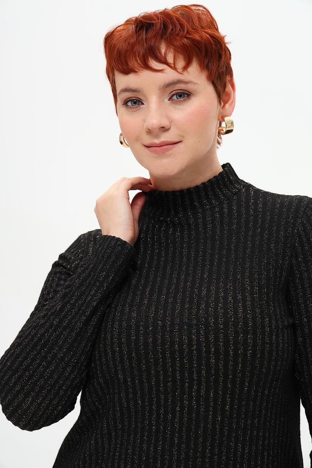 Пуловер имеет приталенный силуэт и высокий воротник-стойку. Вертикальные полоски с добавлением металлизированной нити придают изделию изысканный и праздничный вид. Текстура полосок создает интересный визуальный эффект.