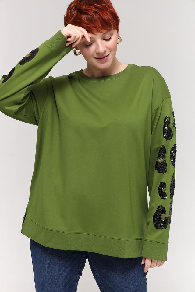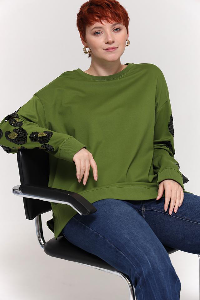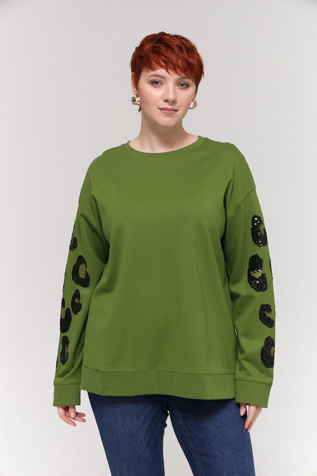 Особенностью данной модели является декор на рукавах – эффектный леопардовый принт, который добавляет образу динамичности и оригинальности. Пуловер имеет круглый вырез горловины и длинные рукава.