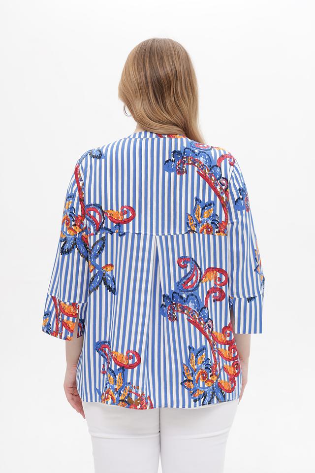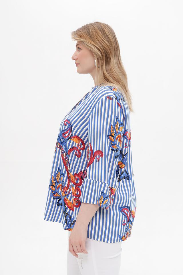 Особенностью данной блузы является яркий цветочный принт на фоне голубой полоски. Такое сочетание цветов и узоров делает блузу оригинальной и привлекательной. Рукава 3/4 делают ее универсальной для любого времени года.
