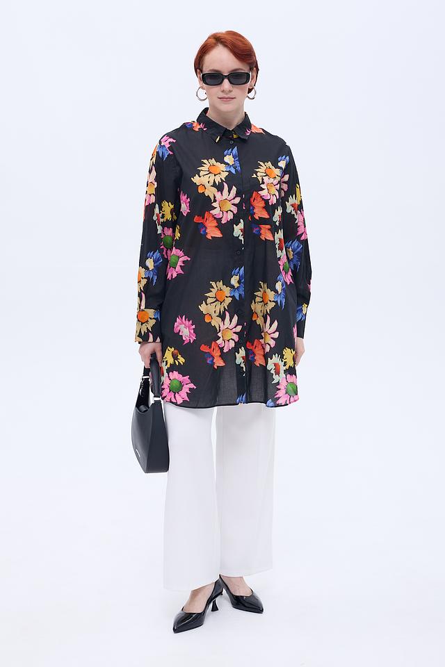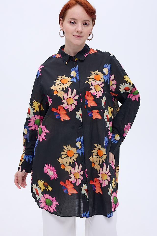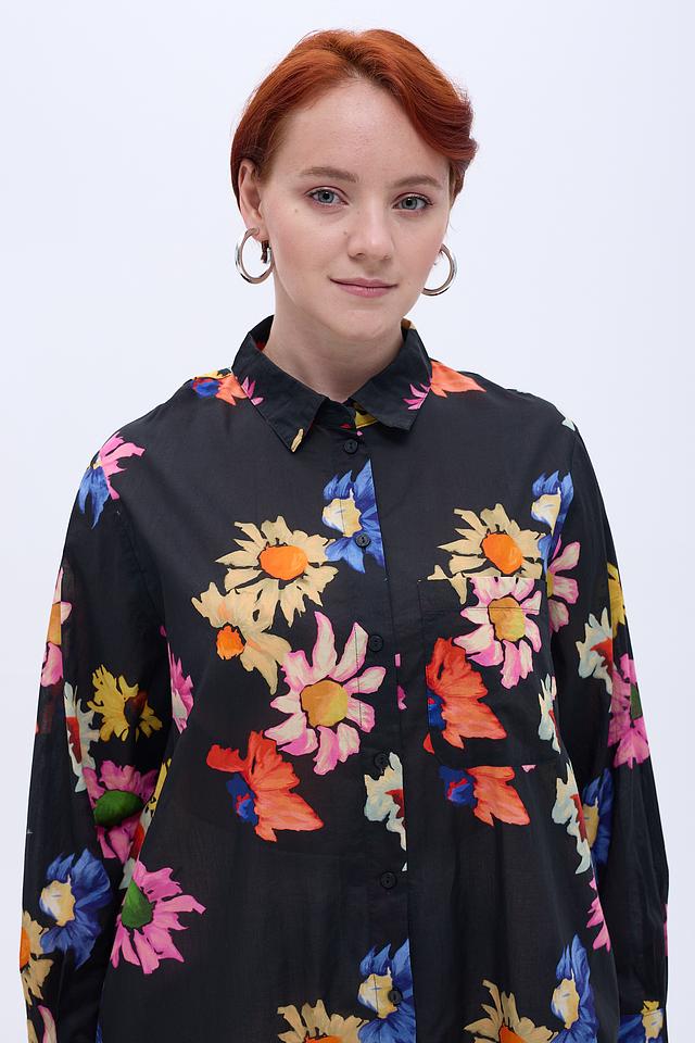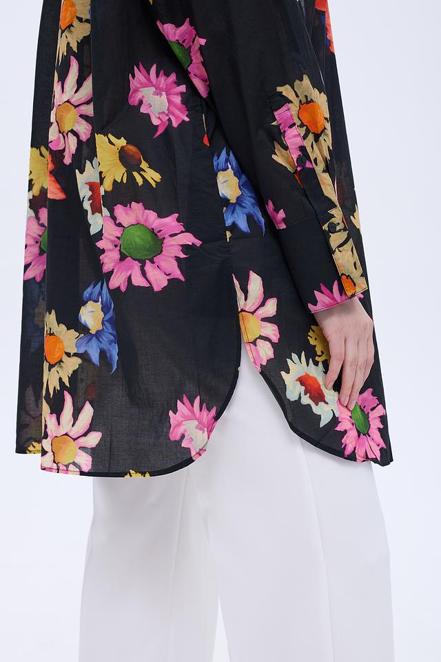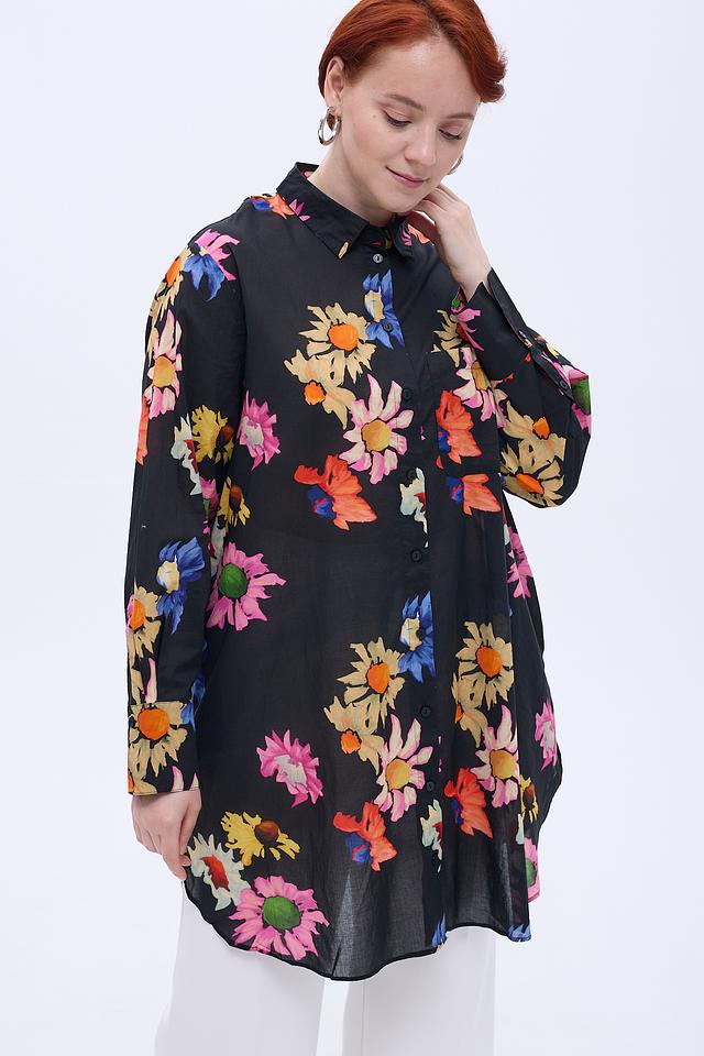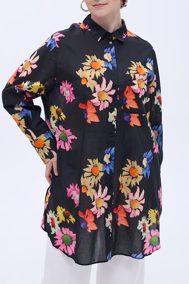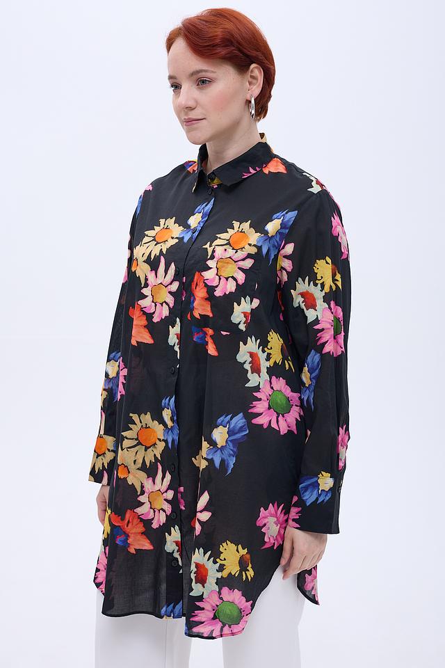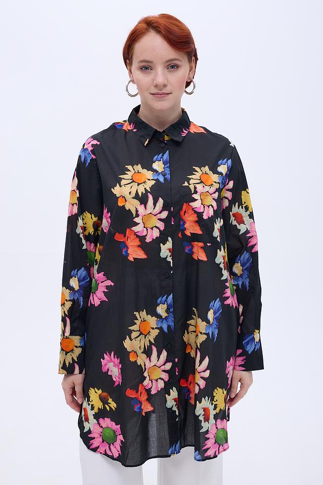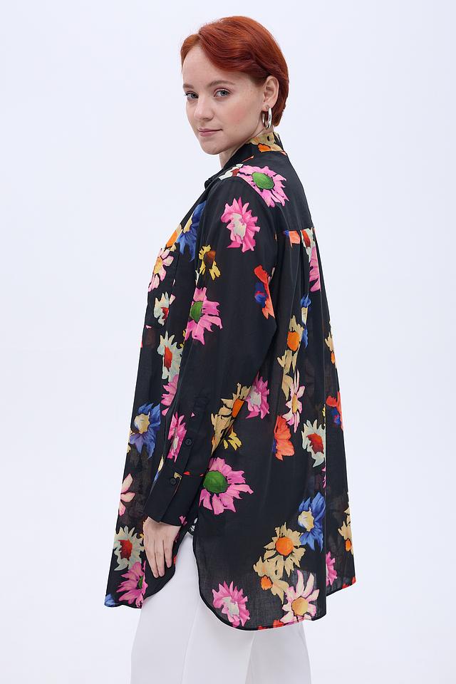 Блуза имеет классический воротник и планку с пуговицами. Длинные рукава заканчиваются притачными манжетами. Привлекательный цветочный принт добавляет образу женственности и легкости.