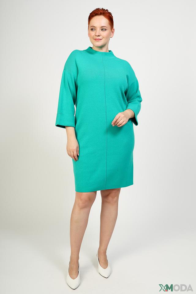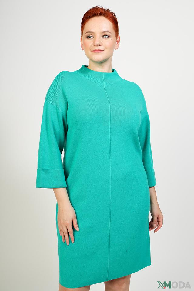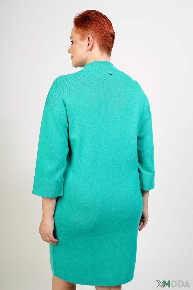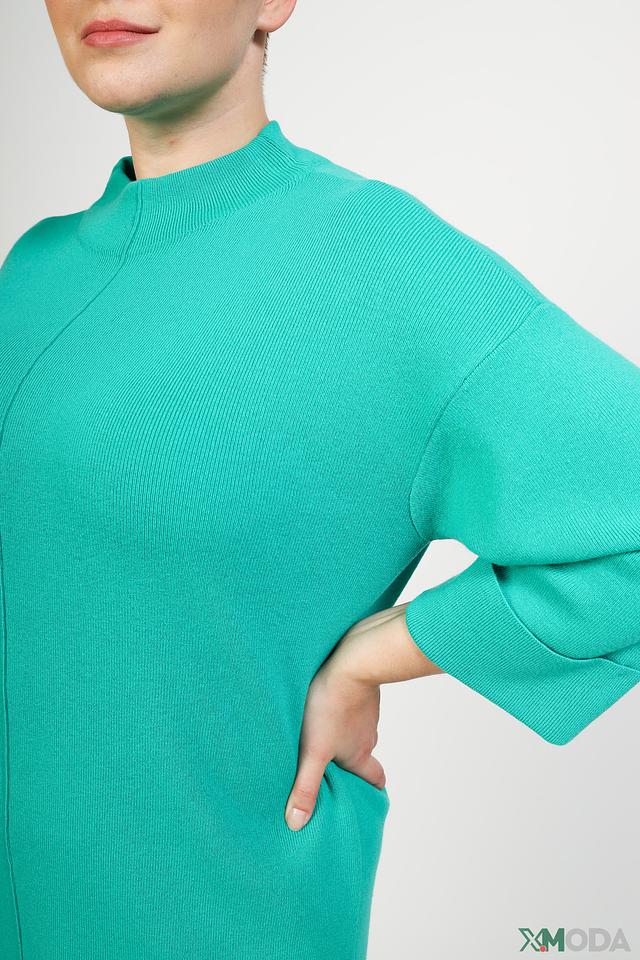 Платье имеет прямой силуэт, длину до колена и рукава три четверти. Высокий округлый вырез горловины добавляет элегантности образу. Платье выполнено в насыщенном бирюзовом цвете, который освежает и придает образу легкость.